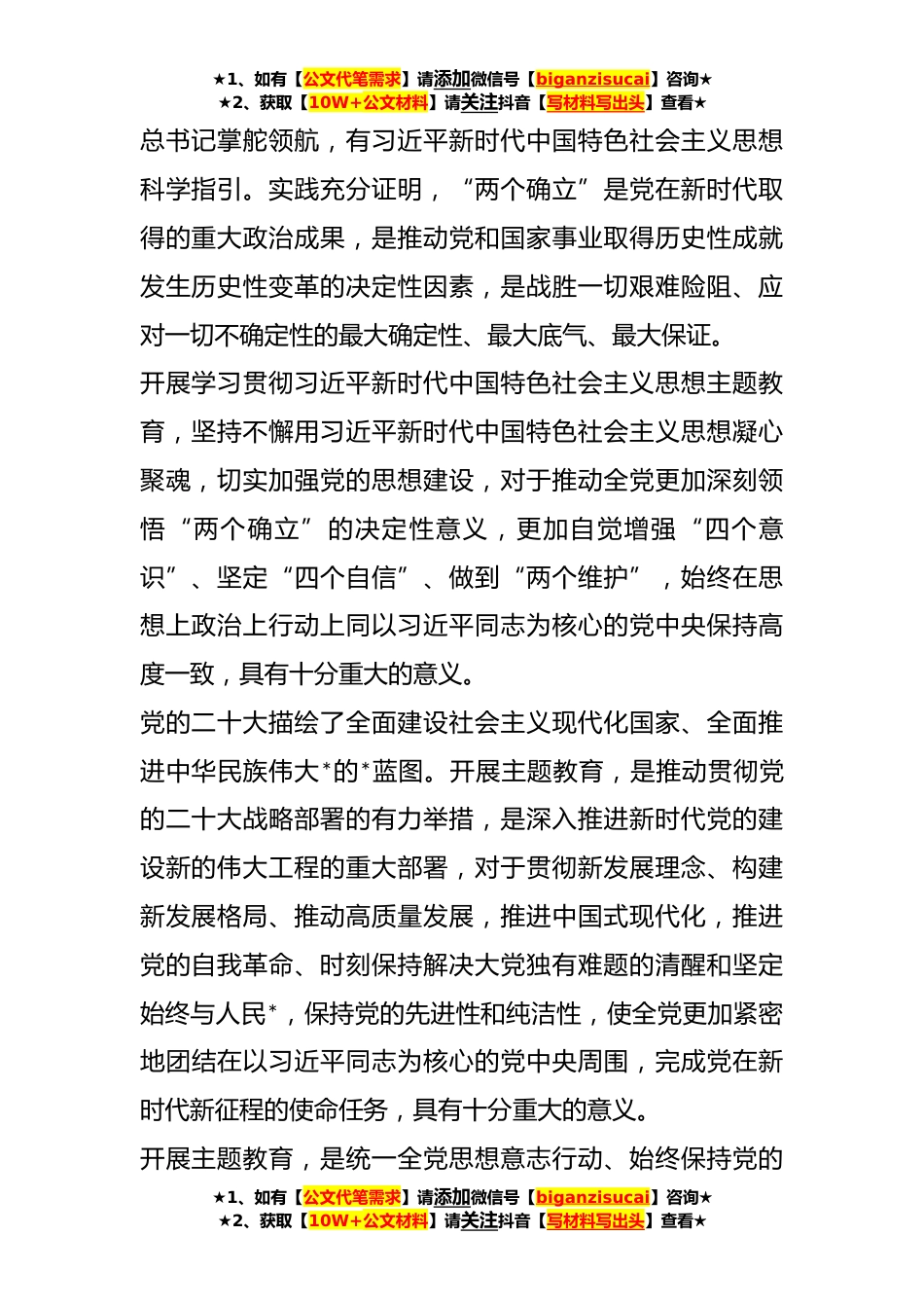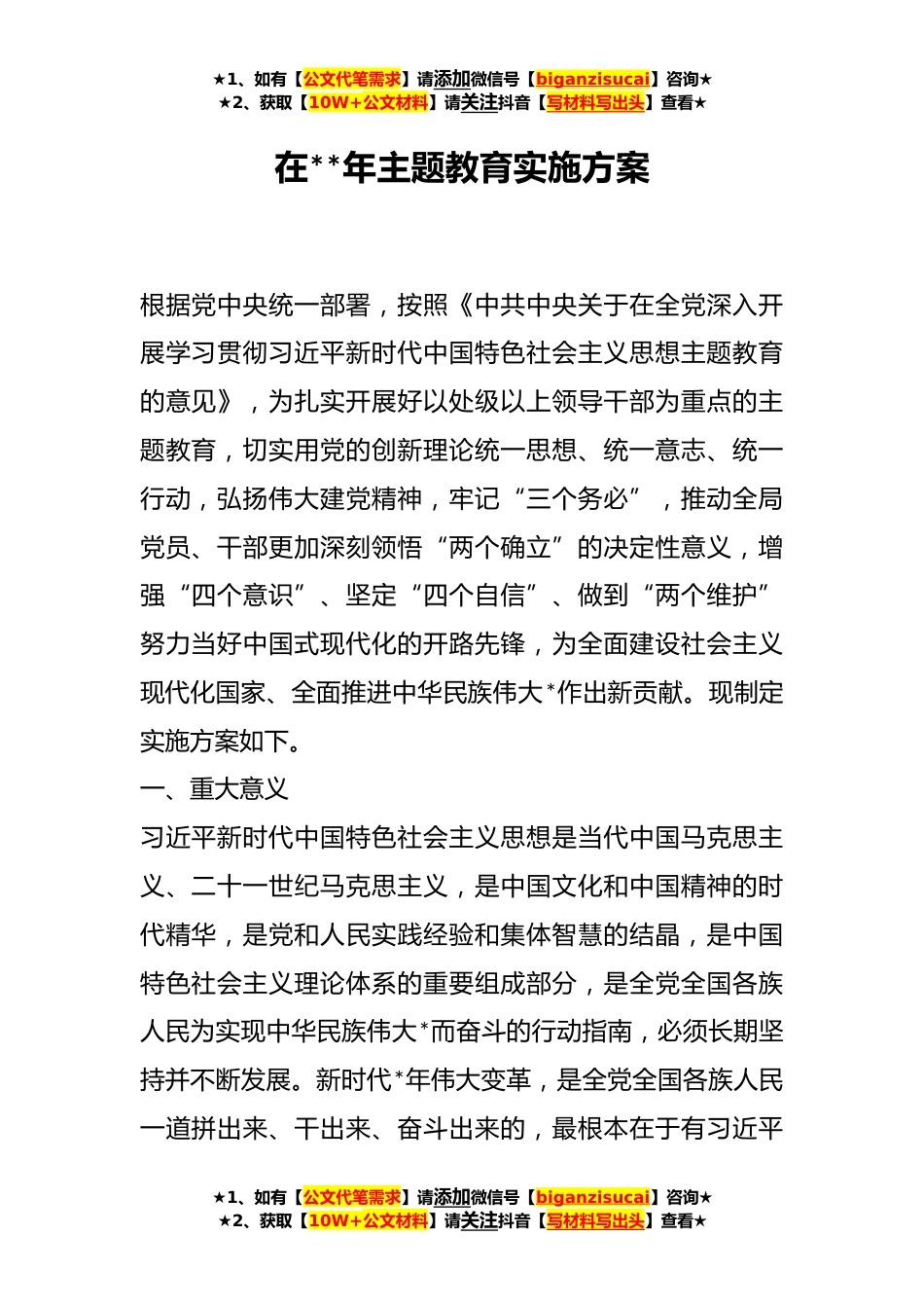 ★1、如有【公文代笔需求】请添加微信号【biganzisucai】咨询★★2、获取【10W+公文材料】请关注抖音【写材料写出头】查看★在**年主题教育实施方案根据党中央统一部署,按照《中共中央关于在全党深入开展学习贯彻习近平新时代中国特色社会主义思想主题教育的意见》,为扎实开展好以处级以上领导干部为重点的主题教育,切实用党的创新理论统一思想、统一意志、统一行动,弘扬伟大建党精神,牢记“三个务必”,推动全局党员、干部更加深刻领悟“两个确立”的决定性意义,增强“四个意识”、坚定“四个自信”、做到“两个维护”努力当好中国式现代化的开路先锋,为全面建设社会主义现代化国家、全面推进中华民族伟大*作出新贡献。现制定实施方案如下。一、重大意义习近平新时代中国特色社会主义思想是当代中国马克思...