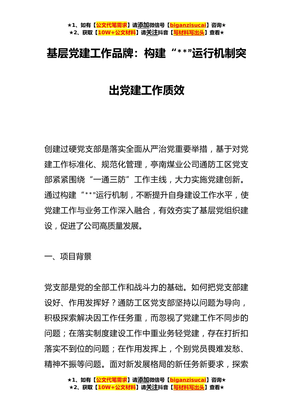 ★1、如有【公文代笔需求】请添加微信号【biganzisucai】咨询★★2、获取【10W+公文材料】请关注抖音【写材料写出头】查看★基层党建工作品牌:构建“**”运行机制突出党建工作质效创建过硬党支部是落实全面从严治党重要举措,基于对党建工作标准化、规范化管理,亭南煤业公司通防工区党支部紧紧围绕“一通三防”工作主线,大力实施党建创新。通过构建“**”运行机制,不断提升自身建设工作水平,使党建工作与业务工作深入融合,有效夯实了基层党组织建设,促进了公司高质量发展。一、项目背景党支部是党的全部工作和战斗力的基础。如何把党支部建设好、作用发挥好?通防工区党支部坚持以问题为导向,积极探索解决因工作任务重,而忽视了党建工作不同步的问题;在落实制度建设工作中重业务轻党建,存在打折扣落实...
