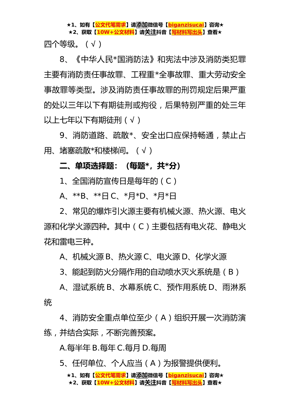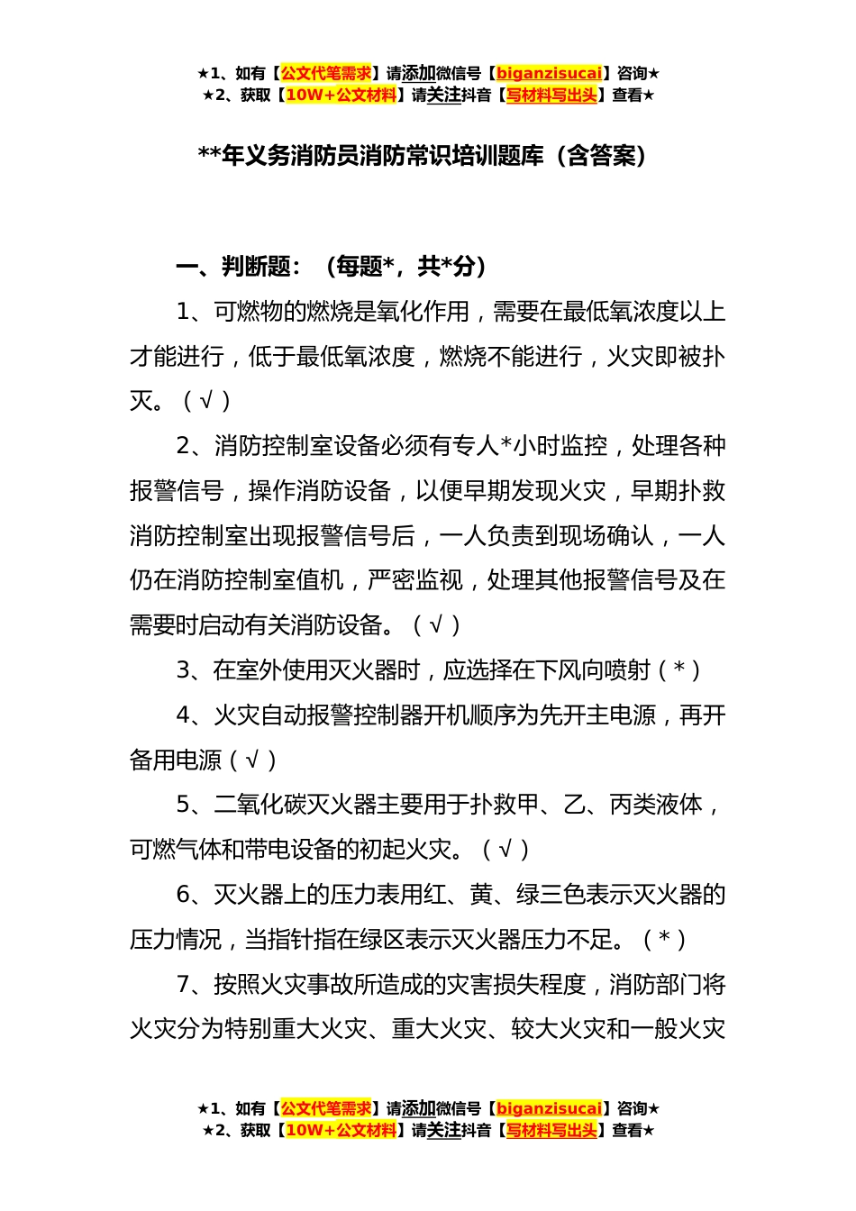 ★1、如有【公文代笔需求】请添加微信号【biganzisucai】咨询★★2、获取【10W+公文材料】请关注抖音【写材料写出头】查看★**年义务消防员消防常识培训题库(含答案)一、判断题:(每题*,共*分)1、可燃物的燃烧是氧化作用,需要在最低氧浓度以上才能进行,低于最低氧浓度,燃烧不能进行,火灾即被扑灭。(√)2、消防控制室设备必须有专人*小时监控,处理各种报警信号,操作消防设备,以便早期发现火灾,早期扑救消防控制室出现报警信号后,一人负责到现场确认,一人仍在消防控制室值机,严密监视,处理其他报警信号及在需要时启动有关消防设备。(√)3、在室外使用灭火器时,应选择在下风向喷射(*)4、火灾自动报警控制器开机顺序为先开主电源,再开备用电源(√)5、二氧化碳灭火器主要用于扑救甲、乙、丙...