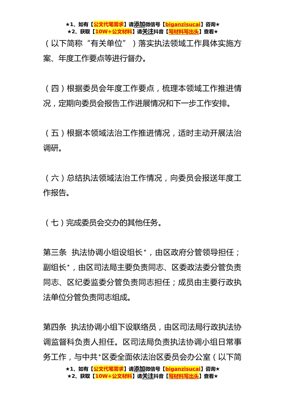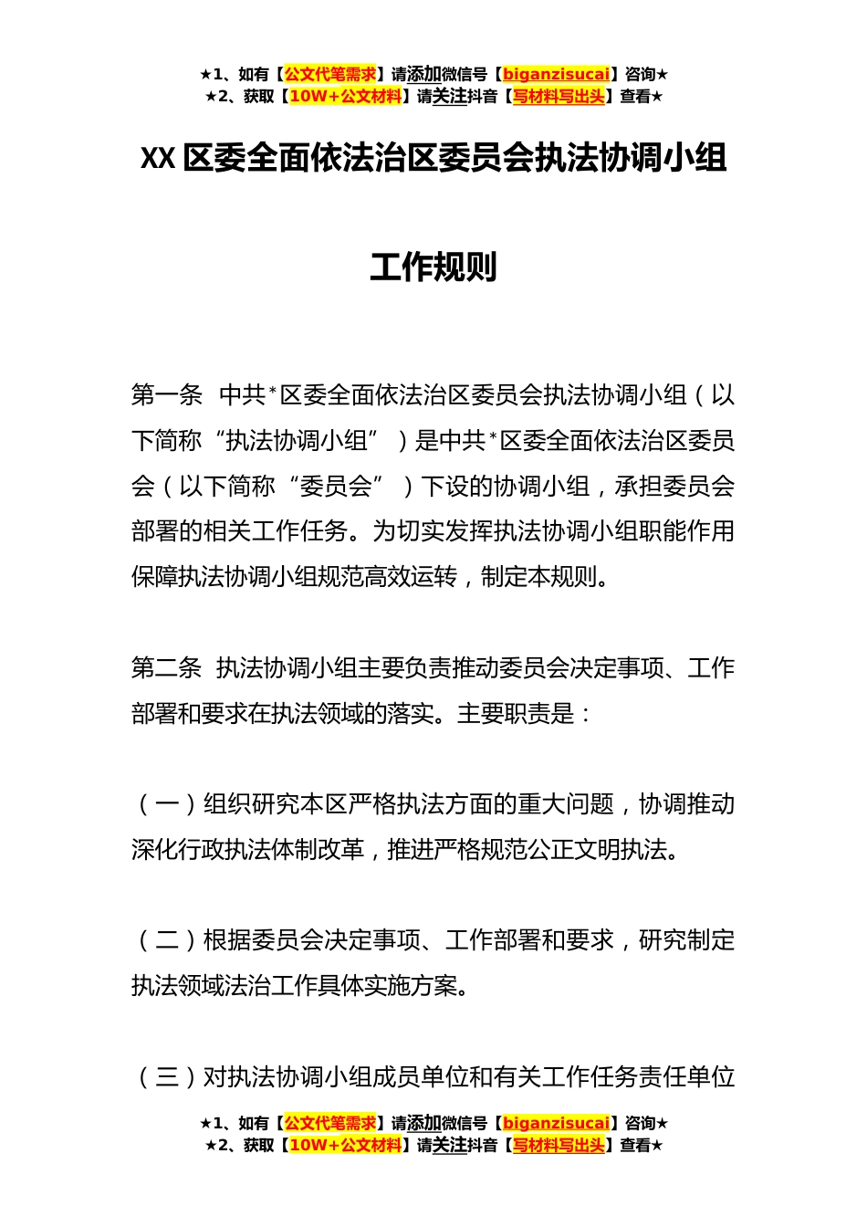★1、如有【公文代笔需求】请添加微信号【biganzisucai】咨询★★2、获取【10W+公文材料】请关注抖音【写材料写出头】查看★XX区委全面依法治区委员会执法协调小组工作规则第一条中共*区委全面依法治区委员会执法协调小组(以下简称“执法协调小组”)是中共*区委全面依法治区委员会(以下简称“委员会”)下设的协调小组,承担委员会部署的相关工作任务。为切实发挥执法协调小组职能作用保障执法协调小组规范高效运转,制定本规则。第二条执法协调小组主要负责推动委员会决定事项、工作部署和要求在执法领域的落实。主要职责是:(一)组织研究本区严格执法方面的重大问题,协调推动深化行政执法体制改革,推进严格规范公正文明执法。(二)根据委员会决定事项、工作部署和要求,研究制定执法领域法治工作具体实...