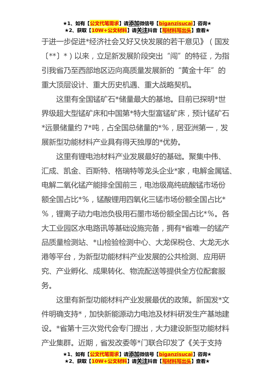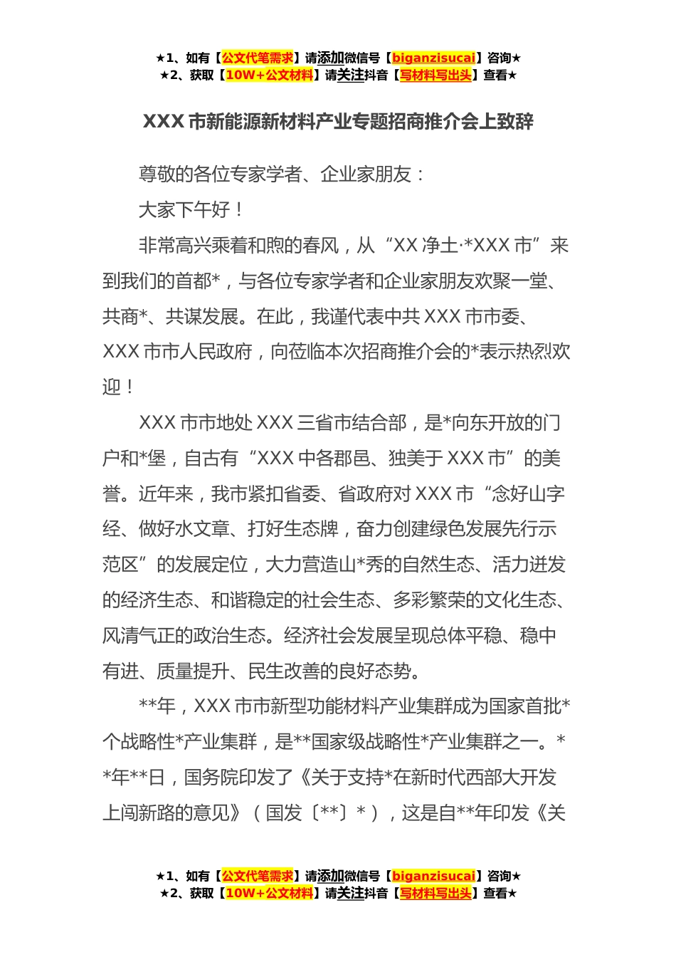 ★1、如有【公文代笔需求】请添加微信号【biganzisucai】咨询★★2、获取【10W+公文材料】请关注抖音【写材料写出头】查看★XXX市新能源新材料产业专题招商推介会上致辞尊敬的各位专家学者、企业家朋友:大家下午好!非常高兴乘着和煦的春风,从“XX净土·*XXX市”来到我们的首都*,与各位专家学者和企业家朋友欢聚一堂、共商*、共谋发展。在此,我谨代表中共XXX市市委、XXX市市人民政府,向莅临本次招商推介会的*表示热烈欢迎!XXX市市地处XXX三省市结合部,是*向东开放的门户和*堡,自古有“XXX中各郡邑、独美于XXX市”的美誉。近年来,我市紧扣省委、省政府对XXX市“念好山字经、做好水文章、打好生态牌,奋力创建绿色发展先行示范区”的发展定位,大力营造山*秀的自然生态、活力迸发的经济生态、和谐稳定的社...