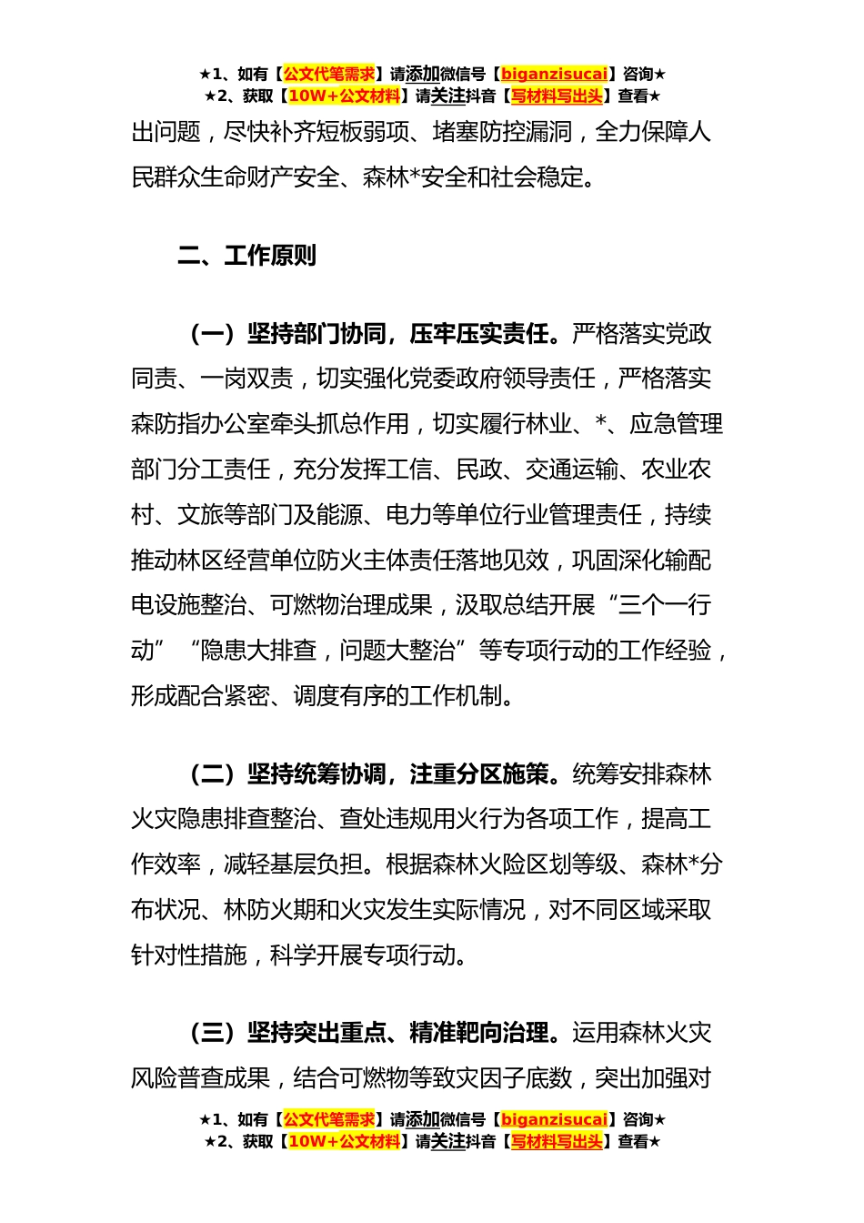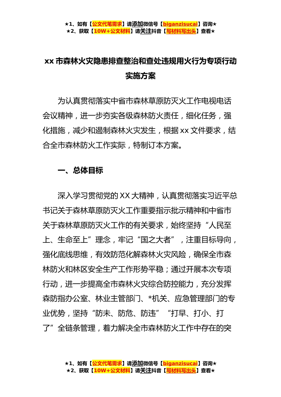 ★1、如有【公文代笔需求】请添加微信号【biganzisucai】咨询★★2、获取【10W+公文材料】请关注抖音【写材料写出头】查看★xx市森林火灾隐患排查整治和查处违规用火行为专项行动实施方案为认真贯彻落实中省市森林草原防灭火工作电视电话会议精神,进一步夯实各级森林防火责任,细化任务,强化措施,减少和遏制森林火灾发生,根据xx文件要求,结合全市森林防火工作实际,特制订本方案。一、总体目标深入学习贯彻党的XX大精神,认真贯彻落实习近平总书记关于森林草原防灭火工作重要指示批示精神和中省市关于森林草原防灭火工作的有关要求,始终坚持“人民至上、生命至上”理念,牢记“国之大者”,注重目标导向,强化底线思维,有效防范化解森林火灾风险,确保全市森林防火和林区安全生产工作形势平稳;通过开展本...