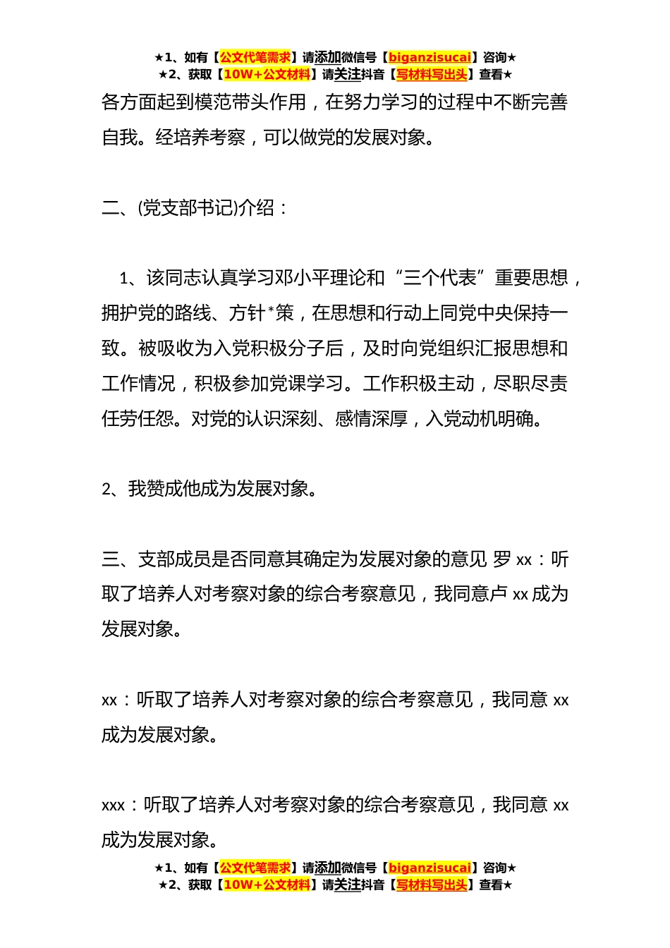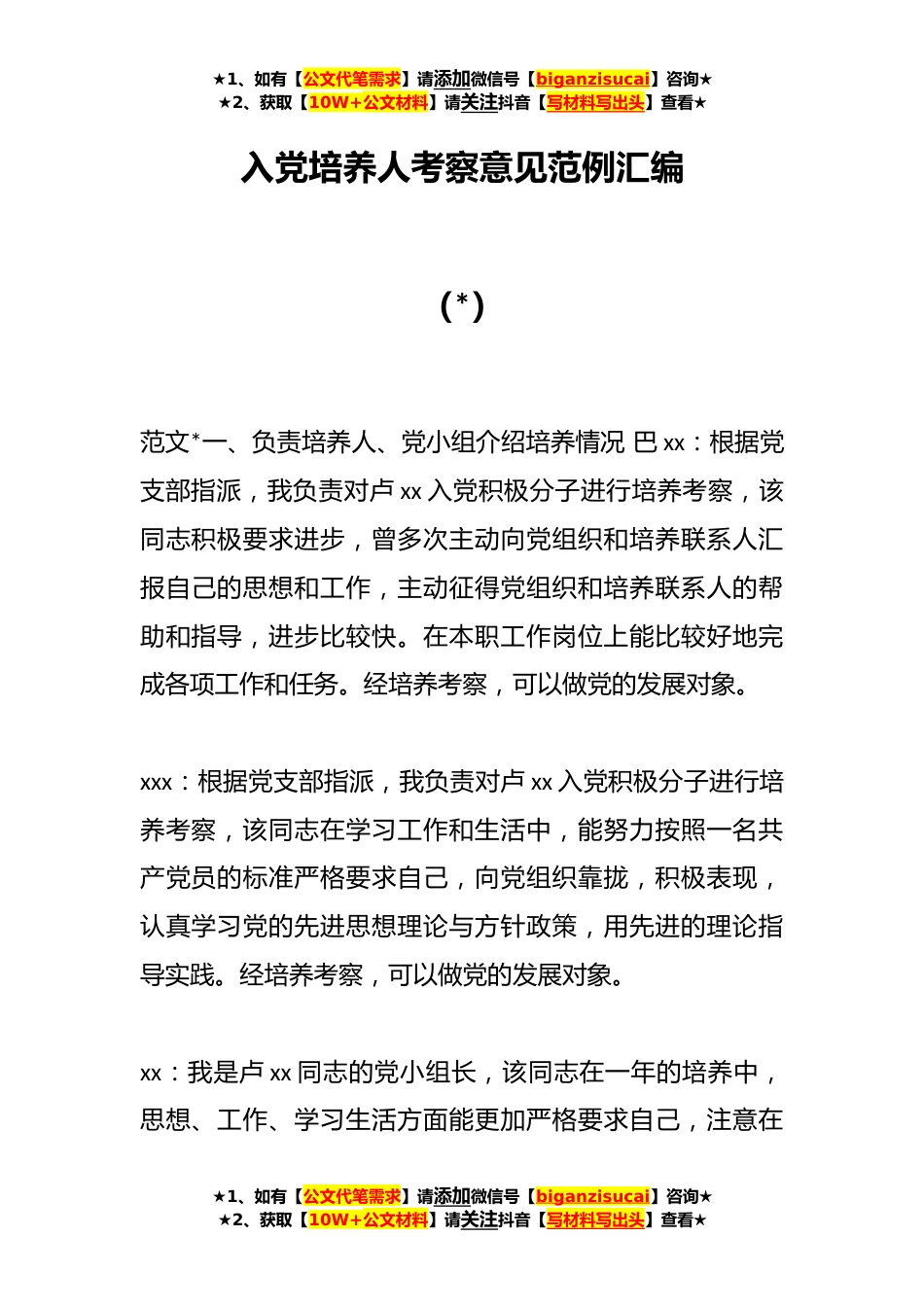 ★1、如有【公文代笔需求】请添加微信号【biganzisucai】咨询★★2、获取【10W+公文材料】请关注抖音【写材料写出头】查看★入党培养人考察意见范例汇编(*)范文*一、负责培养人、党小组介绍培养情况巴xx:根据党支部指派,我负责对卢xx入党积极分子进行培养考察,该同志积极要求进步,曾多次主动向党组织和培养联系人汇报自己的思想和工作,主动征得党组织和培养联系人的帮助和指导,进步比较快。在本职工作岗位上能比较好地完成各项工作和任务。经培养考察,可以做党的发展对象。xxx:根据党支部指派,我负责对卢xx入党积极分子进行培养考察,该同志在学习工作和生活中,能努力按照一名共产党员的标准严格要求自己,向党组织靠拢,积极表现,认真学习党的先进思想理论与方针政策,用先进的理论指导实践。经培养...