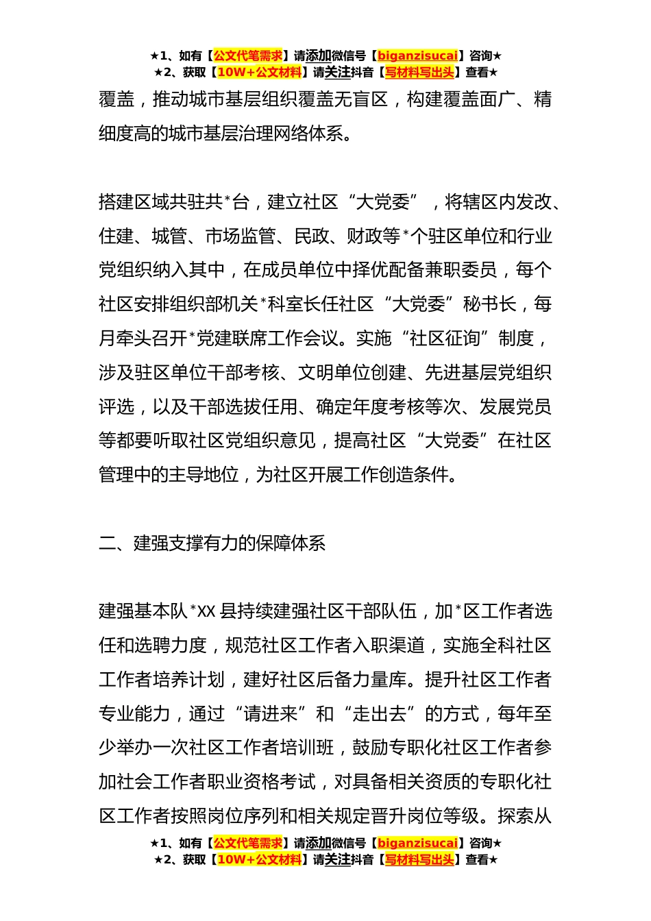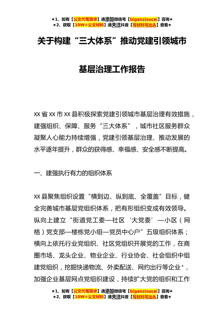 ★1、如有【公文代笔需求】请添加微信号【biganzisucai】咨询★★2、获取【10W+公文材料】请关注抖音【写材料写出头】查看★关于构建“三大体系”推动党建引领城市基层治理工作报告XX省XX市XX县积极探索党建引领城市基层治理有效措施,建强组织、保障、服务“三大体系”,城市社区服务群众凝聚人心能力持续增强,党建引领基层治理、推动发展的水平逐年提升,群众的获得感、幸福感、安全感不断提高。一、建强执行有力的组织体系XX县聚焦组织设置“横到边、纵到底、全覆盖”目标,健全完善城市基层党组织体系,把有形组织变成有效领导。纵向上建立“街道党工委—社区‘大党委’—小区(网格)党支部—楼栋党小组—党员中心户”五级组织体系;横向上依托行业党组织、社区党组织开展党的工作,在商圈市场、龙头企业、...