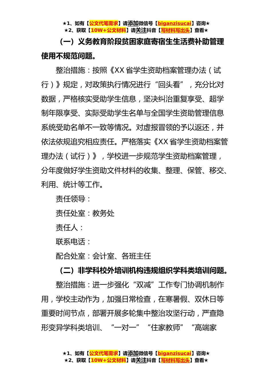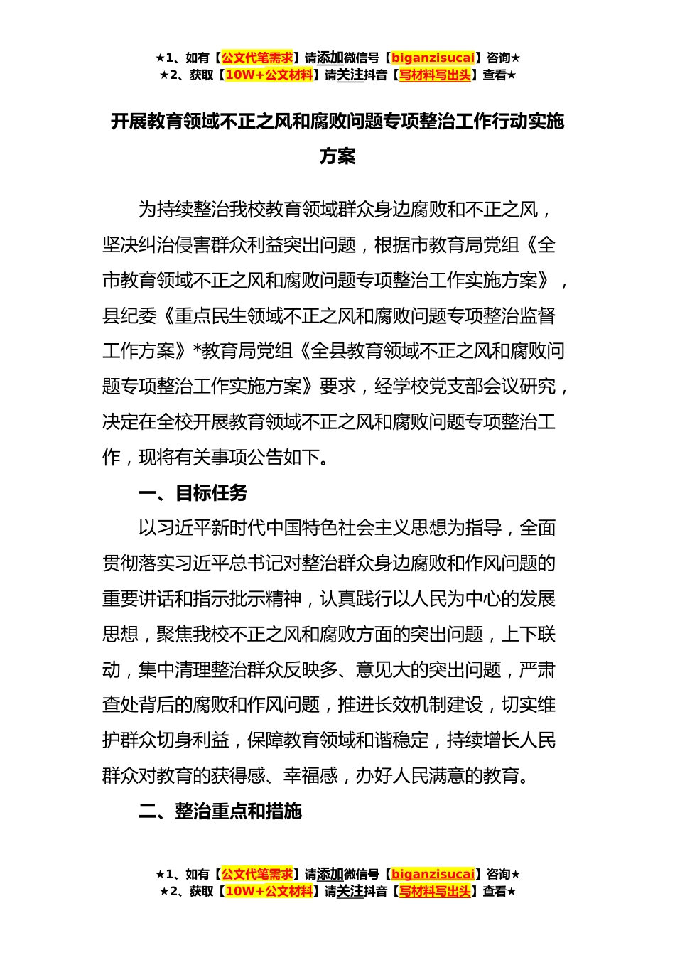 ★1、如有【公文代笔需求】请添加微信号【biganzisucai】咨询★★2、获取【10W+公文材料】请关注抖音【写材料写出头】查看★开展教育领域不正之风和腐败问题专项整治工作行动实施方案为持续整治我校教育领域群众身边腐败和不正之风,坚决纠治侵害群众利益突出问题,根据市教育局党组《全市教育领域不正之风和腐败问题专项整治工作实施方案》,县纪委《重点民生领域不正之风和腐败问题专项整治监督工作方案》*教育局党组《全县教育领域不正之风和腐败问题专项整治工作实施方案》要求,经学校党支部会议研究,决定在全校开展教育领域不正之风和腐败问题专项整治工作,现将有关事项公告如下。一、目标任务以习近平新时代中国特色社会主义思想为指导,全面贯彻落实习近平总书记对整治群众身边腐败和作风问题的重要讲话...