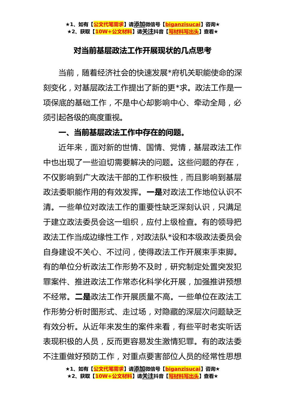★1、如有【公文代笔需求】请添加微信号【biganzisucai】咨询★★2、获取【10W+公文材料】请关注抖音【写材料写出头】查看★对当前基层政法工作开展现状的几点思考当前,随着经济社会的快速发展*府机关职能使命的深刻变化,对基层政法工作提出了新的更*求。政法工作是一项保底的基础工作,不是中心却影响中心、牵动全局,必须引起各级的高度重视。一、当前基层政法工作中存在的问题。近年来,面对新的世情、国情、党情,基层政法工作中也出现了一些迫切需要解决的问题。这些问题的存在,不仅影响到广大政法干部的工作积极性,而且影响到基层政法委职能作用的有效发挥。一是对政法工作地位认识不清。一些单位对政法工作的重要性缺乏深刻认识,只满足于建立政法委员会这一组织,应付上级检查。有的领导把政法工作当...