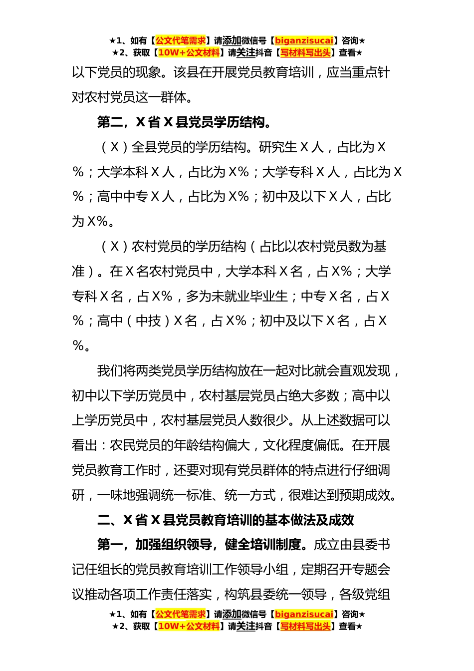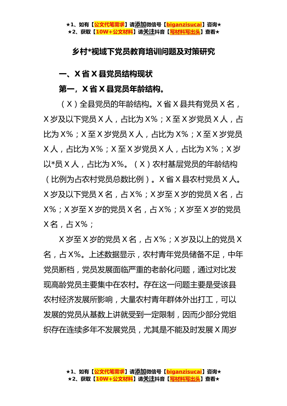 ★1、如有【公文代笔需求】请添加微信号【biganzisucai】咨询★★2、获取【10W+公文材料】请关注抖音【写材料写出头】查看★乡村*视域下党员教育培训问题及对策研究一、X省X县党员结构现状第一,X省X县党员年龄结构。(X)全县党员的年龄结构。X省X县共有党员X名,X岁及以下党员X人,占比为X%;X至X岁党员X人,占比为X%;X至X岁党员X人,占比为X%;X至X岁党员X人,占比为X%;X至X岁党员X人,占比为X%;X岁以*员X人,占比为X%。(X)农村基层党员的年龄结构(比例为占农村党员总数比例)。X省X县农村党员X人。X岁及以下党员X名,占X%;X岁至X岁的党员X名,占X%;X岁至X岁的党员X名,占X%;X岁至X岁的党员X名,占X%;X岁至X岁的党员X名,占X%;X岁及以上的党员X名,占X%。上述数据显示,农村青年党员储...