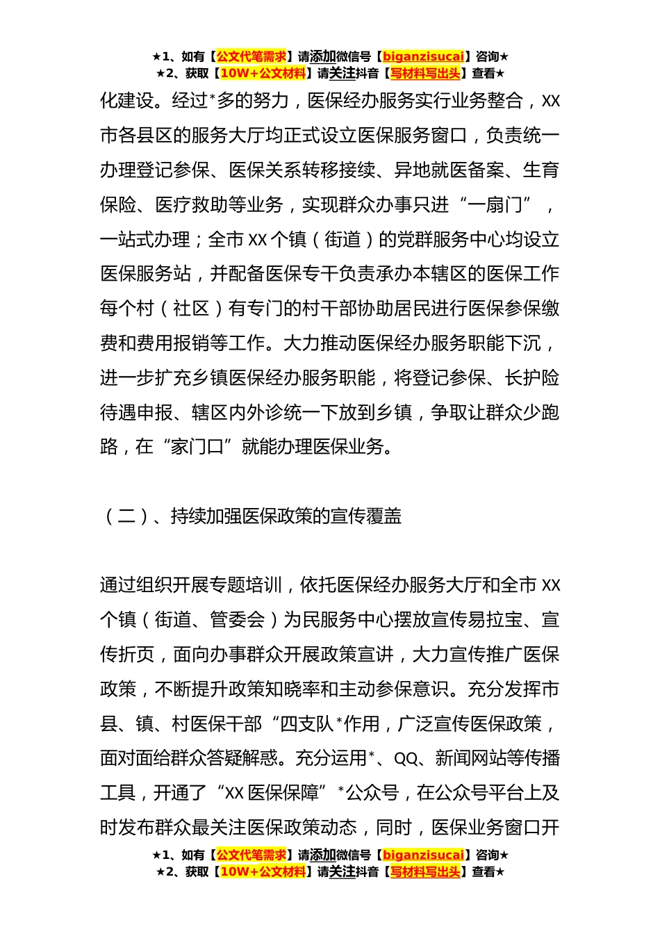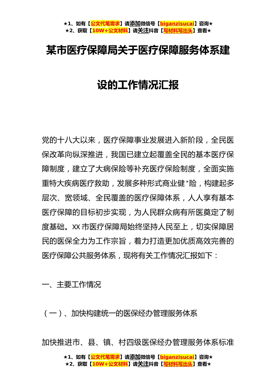 ★1、如有【公文代笔需求】请添加微信号【biganzisucai】咨询★★2、获取【10W+公文材料】请关注抖音【写材料写出头】查看★某市医疗保障局关于医疗保障服务体系建设的工作情况汇报党的十八大以来,医疗保障事业发展进入新阶段,全民医保改革向纵深推进,我国已建立起覆盖全民的基本医疗保障制度,建立了大病保险等补充医疗保险制度,全面实施重特大疾病医疗救助,发展多种形式商业健*险,构建起多层次、宽领域、全民覆盖的医疗保障体系,人人享有基本医疗保障的目标初步实现,为人民群众病有所医奠定了制度基础。XX市医疗保障局始终坚持人民至上,切实保障居民的医保全力为工作宗旨,着力打造更加优质高效完善的医疗保障公共服务体系,现将有关工作情况汇报如下:一、主要工作情况(一)、加快构建统一的医保经办...
