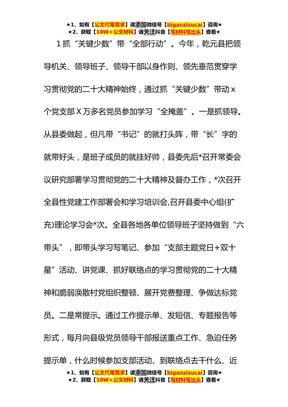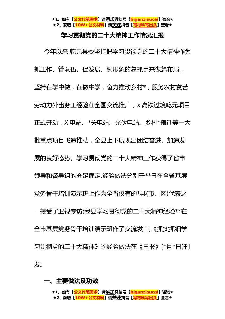 ★1、如有【公文代笔需求】请添加微信号【biganzisucai】咨询★★2、获取【10W+公文材料】请关注抖音【写材料写出头】查看★学习贯彻党的二十大精神工作情况汇报今年以来,乾元县委坚持把学习贯彻党的二十大精神作为抓工作、管队伍、促发展、树形象的总抓手来谋篇布局,坚持在学中做,在做中学,奋力推动乡村*,服务农村贫苦劳动力外出务工经验在全国交流推广,x高铁过境乾元项目正式开动,X电站、*关电站、光伏电站、乡村*搬迁等一大批重点项目飞速推动,全县上下展现出团结奋进、加速发展的良好态势。学习贯彻党的二十大精神工作获得了省市领导和督导组的充足确定,经验做法分别于**日在全省基层党务骨干培训演示班上作为全省仅有的*县(市、区)代表之一接受了卫视专访;我县学习贯彻党的二十大精神经验**在全市基层...
