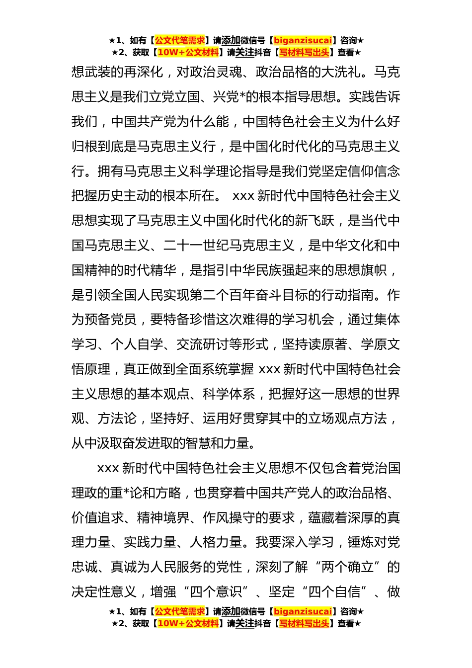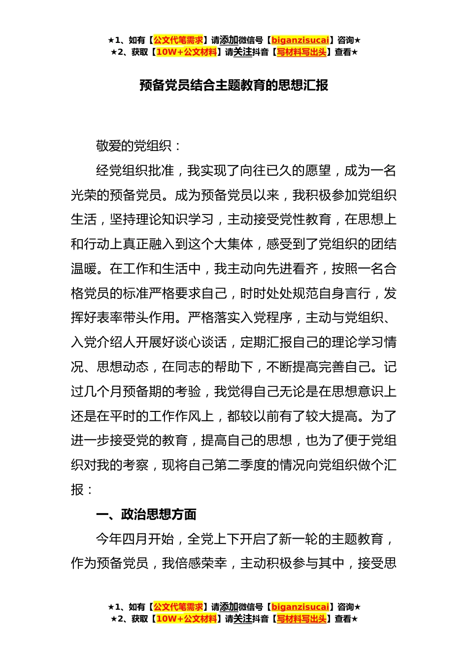 ★1、如有【公文代笔需求】请添加微信号【biganzisucai】咨询★★2、获取【10W+公文材料】请关注抖音【写材料写出头】查看★预备党员结合主题教育的思想汇报敬爱的党组织:经党组织批准,我实现了向往已久的愿望,成为一名光荣的预备党员。成为预备党员以来,我积极参加党组织生活,坚持理论知识学习,主动接受党性教育,在思想上和行动上真正融入到这个大集体,感受到了党组织的团结温暖。在工作和生活中,我主动向先进看齐,按照一名合格党员的标准严格要求自己,时时处处规范自身言行,发挥好表率带头作用。严格落实入党程序,主动与党组织、入党介绍人开展好谈心谈话,定期汇报自己的理论学习情况、思想动态,在同志的帮助下,不断提高完善自己。记过几个月预备期的考验,我觉得自己无论是在思想意识上还是在...
