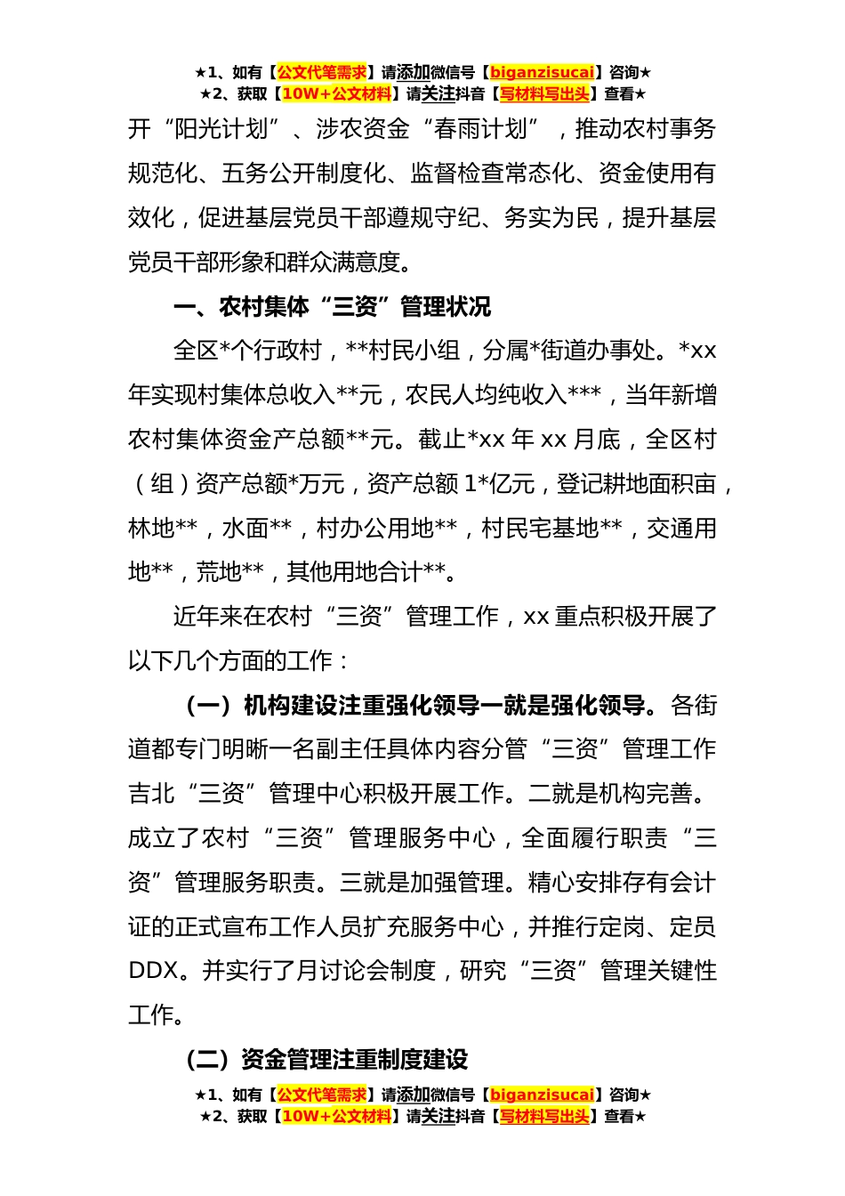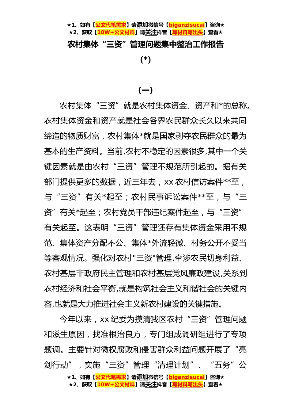 ★1、如有【公文代笔需求】请添加微信号【biganzisucai】咨询★★2、获取【10W+公文材料】请关注抖音【写材料写出头】查看★农村集体“三资”管理问题集中整治工作报告(*)(一)农村集体“三资”就是农村集体资金、资产和*的总称。农村集体资金和资产就是社会各界农民群众长久以来共同缔造的物质财富,农村集体*就是国家剥夺农民群众的最为基本的生产资料。当前,农村不稳定的因素很多,其中一个关键因素就是由农村“三资”管理不规范所引起的。据有关部门提供更多的数据,近三年去,xx农村信访案件**至,与“三资”有关*起至;农村民事诉讼案件**至,与“三资”有关*起至;农村党员干部违纪案件起至,与“三资”有关起至。这表明“三资”管理还存有集体资金采用不规范、集体资产分配不公、集体*外流轻微、村务公开...
