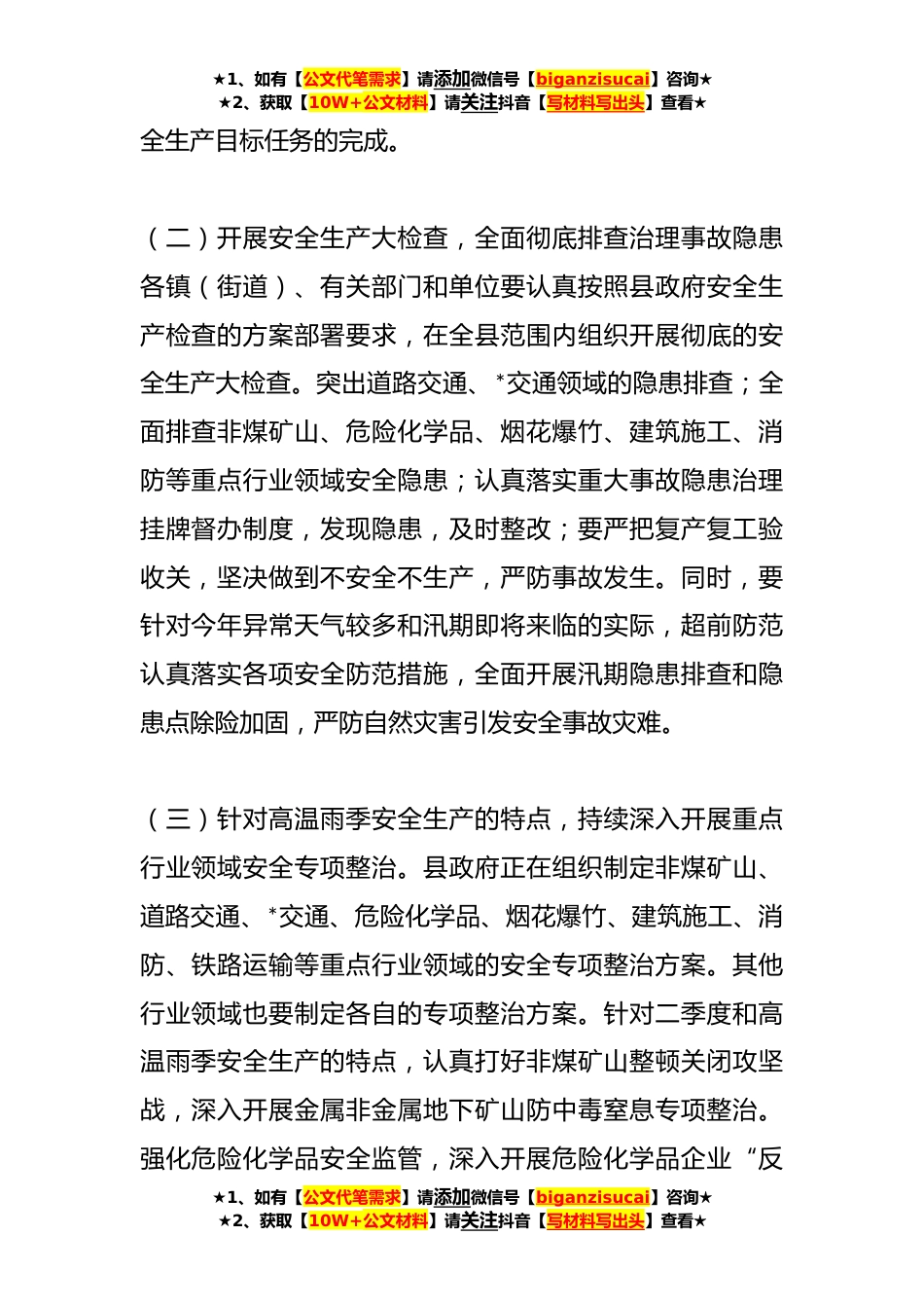 ★1、如有【公文代笔需求】请添加微信号【biganzisucai】咨询★★2、获取【10W+公文材料】请关注抖音【写材料写出头】查看★XX领导在安全生产布置会上的讲话同志们:按照省、市的部署要求,安全生产工作主要目标是:“三个继续下降,一个杜绝”:一是事故总起数和死亡人数继续下降;二是较大事故继续下降;三是反映安全发展水平的(亿元国内生产总值事故死亡率、工矿商贸十万就业人员事故死亡率、道路交通万车死亡率)相对指标继续下降“一个杜绝”是坚决杜绝重大和特别重大事故发生。各镇(街道)各部门各单位要认真针对当前安全生产特点,突出重点,把握规律,重点抓好以下六个方面工作:(一)抓好安全生产目标管理,层层分解落实目标任务。县政府与各镇(街道)各有关部门签订了《**年安全生产责任状》,各镇...