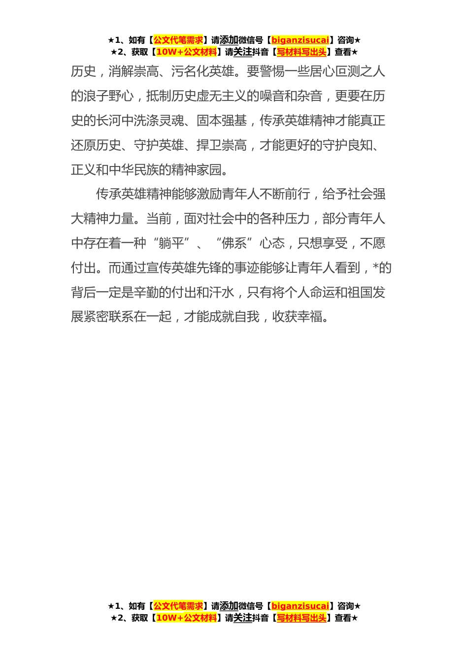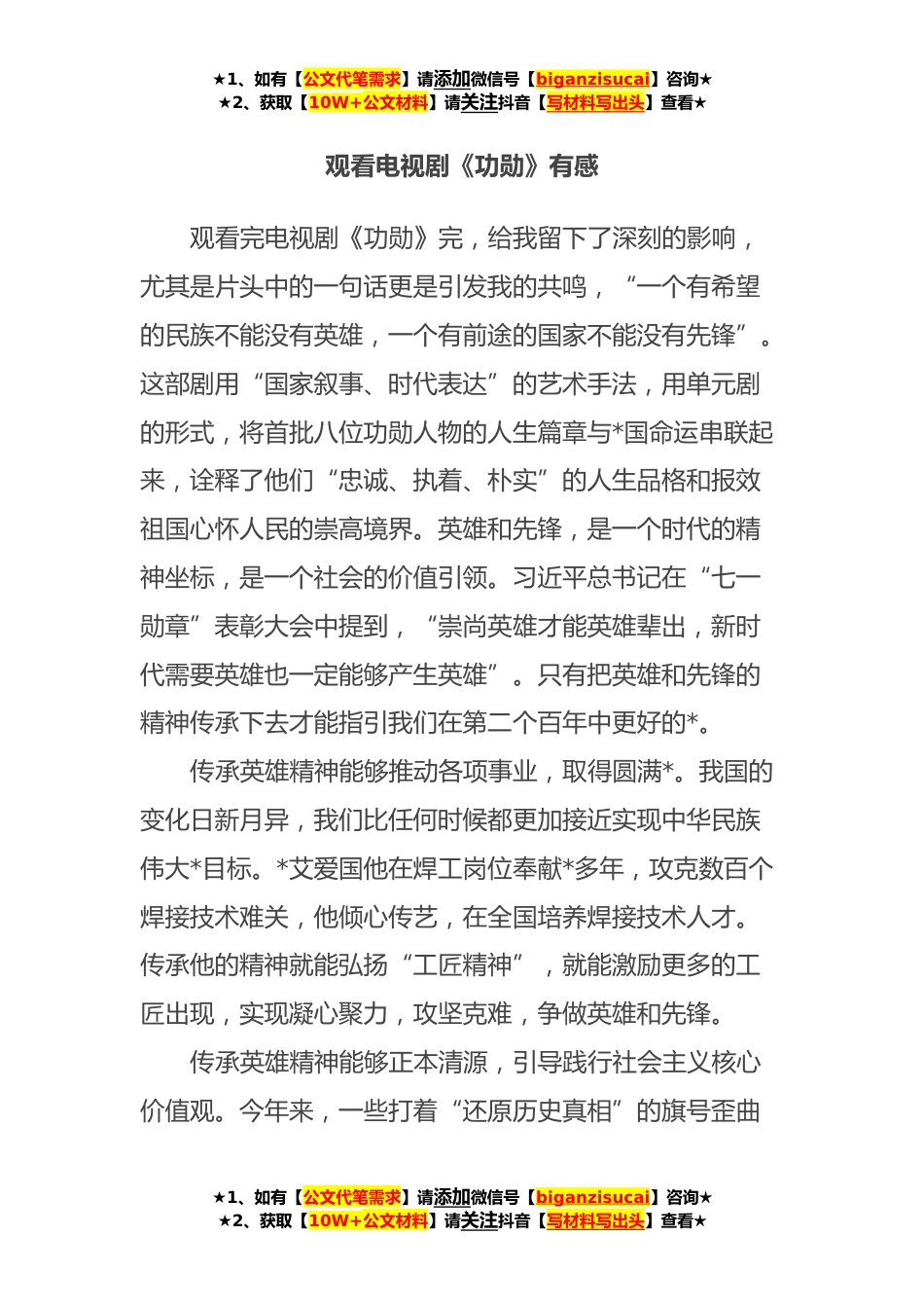 ★1、如有【公文代笔需求】请添加微信号【biganzisucai】咨询★★2、获取【10W+公文材料】请关注抖音【写材料写出头】查看★观看电视剧《功勋》有感观看完电视剧《功勋》完,给我留下了深刻的影响,尤其是片头中的一句话更是引发我的共鸣,“一个有希望的民族不能没有英雄,一个有前途的国家不能没有先锋”。这部剧用“国家叙事、时代表达”的艺术手法,用单元剧的形式,将首批八位功勋人物的人生篇章与*国命运串联起来,诠释了他们“忠诚、执着、朴实”的人生品格和报效祖国心怀人民的崇高境界。英雄和先锋,是一个时代的精神坐标,是一个社会的价值引领。习近平总书记在“七一勋章”表彰大会中提到,“崇尚英雄才能英雄辈出,新时代需要英雄也一定能够产生英雄”。只有把英雄和先锋的精神传承下去才能指引我们在...