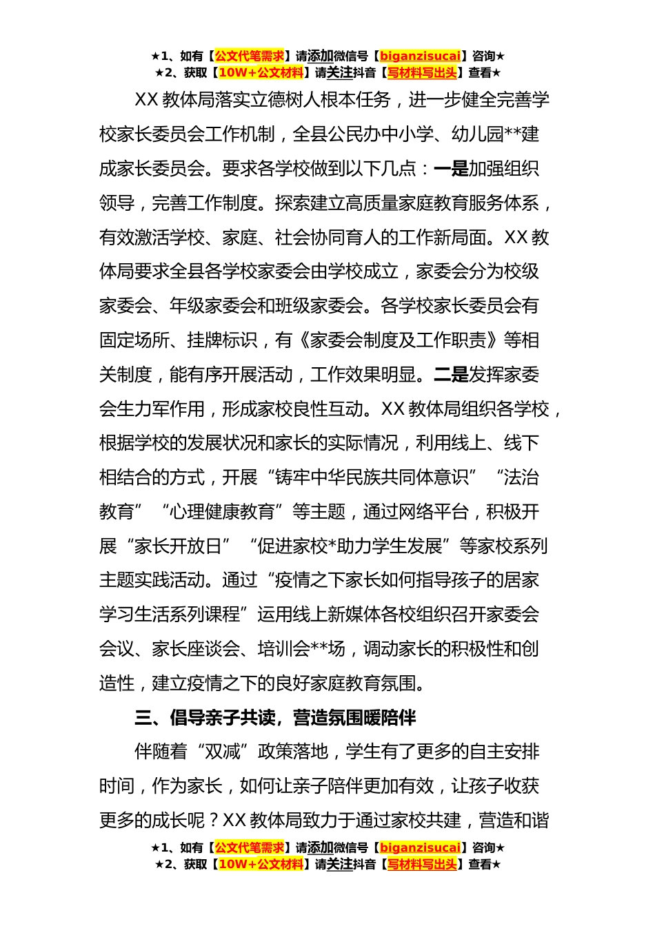 ★1、如有【公文代笔需求】请添加微信号【biganzisucai】咨询★★2、获取【10W+公文材料】请关注抖音【写材料写出头】查看★教体局家校合育工作汇报为全面落实立德树人根本任务,形成和谐、优质、可持续发展的育人环境,近年来,XX教体局致力于提升家校共育合力,构建和谐家校共育体系,多措并举,提升家校共育成效。一、开展“千名教师访万家”活动,家校沟通促和谐以“访家境、知生情、解实困、促成长”为主题,在全县中小学、幼儿园范围内全面推开“千名教师访万家”和“大家访”活动,全县中小学、幼儿园班主任、学科教师,对全县学生进行全覆盖家访,以电话、*、面访等多种形式与家长进行沟通。教体局印发了《“千名教师访万家”工作指导意见》,并向全县教师和家长宣传了“千名教师访万家”和“大家访”的重...
