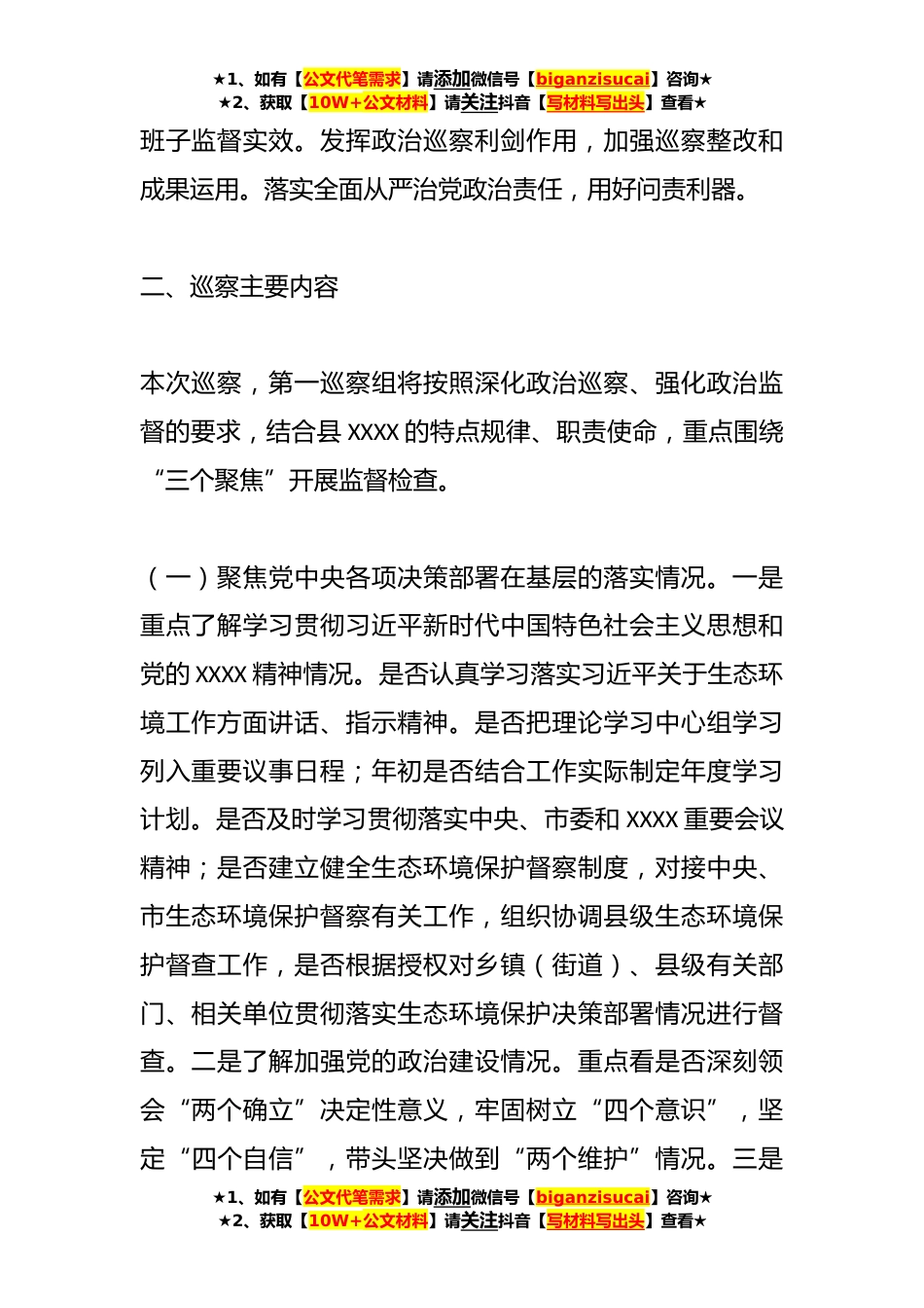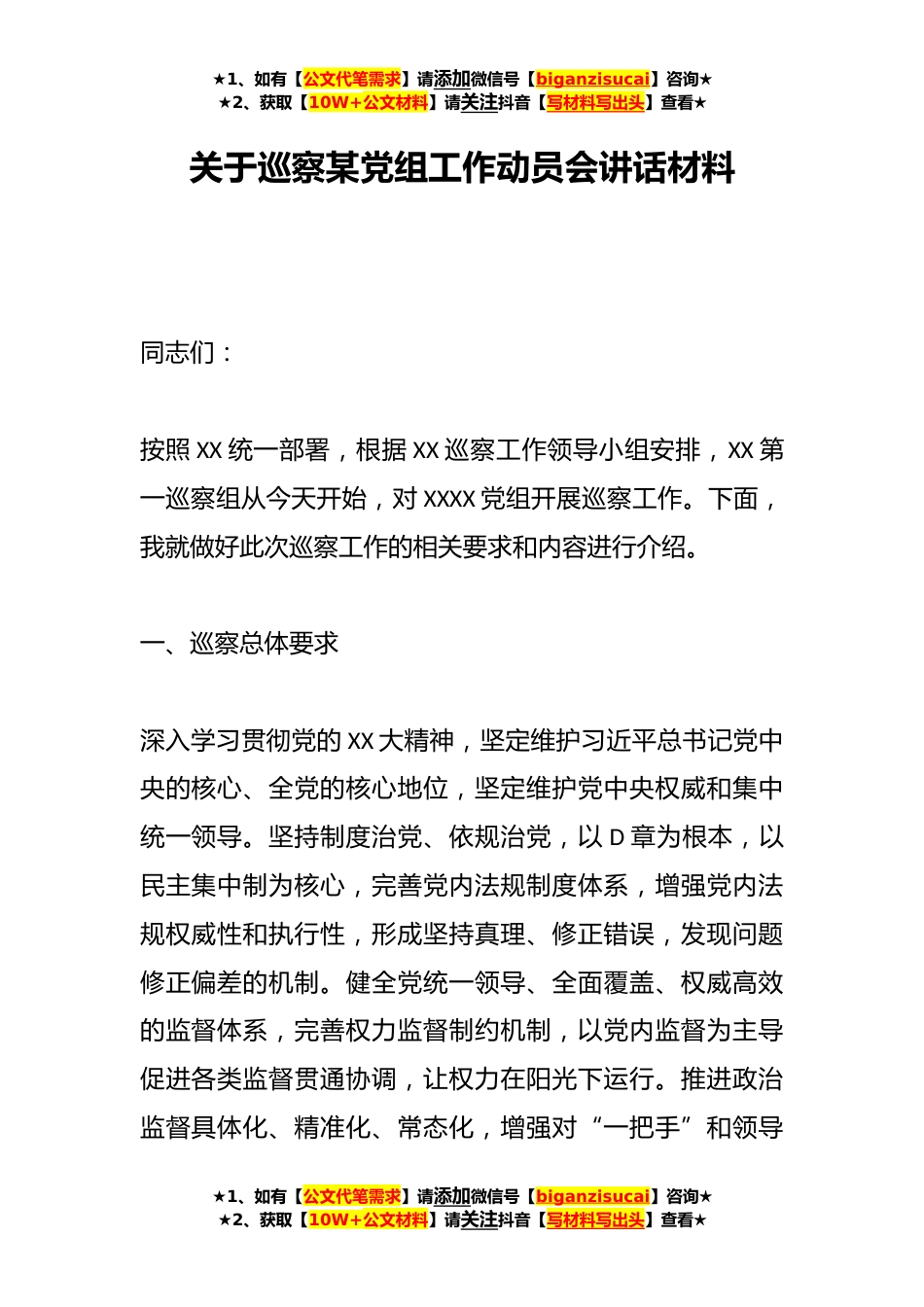 ★1、如有【公文代笔需求】请添加微信号【biganzisucai】咨询★★2、获取【10W+公文材料】请关注抖音【写材料写出头】查看★关于巡察某党组工作动员会讲话材料同志们:按照XX统一部署,根据XX巡察工作领导小组安排,XX第一巡察组从今天开始,对XXXX党组开展巡察工作。下面,我就做好此次巡察工作的相关要求和内容进行介绍。一、巡察总体要求深入学习贯彻党的XX大精神,坚定维护习近平总书记党中央的核心、全党的核心地位,坚定维护党中央权威和集中统一领导。坚持制度治党、依规治党,以D章为根本,以民主集中制为核心,完善党内法规制度体系,增强党内法规权威性和执行性,形成坚持真理、修正错误,发现问题修正偏差的机制。健全党统一领导、全面覆盖、权威高效的监督体系,完善权力监督制约机制,以党内监督为主...