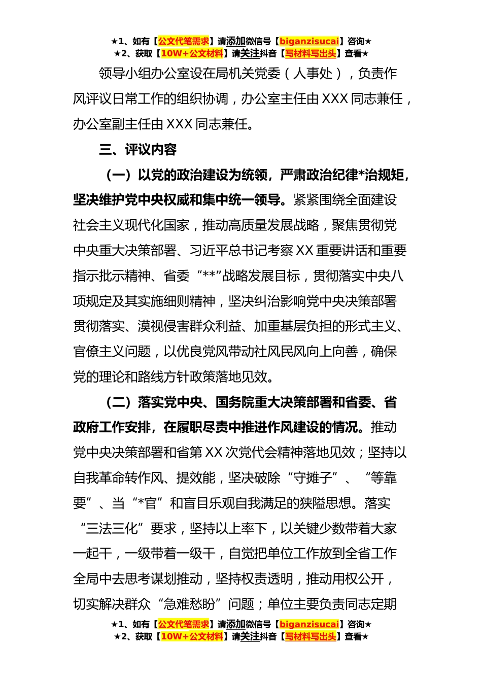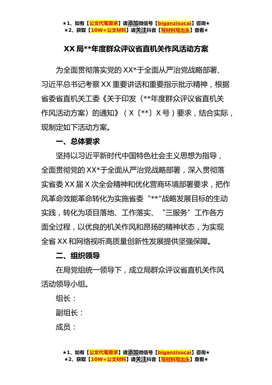 ★1、如有【公文代笔需求】请添加微信号【biganzisucai】咨询★★2、获取【10W+公文材料】请关注抖音【写材料写出头】查看★XX局**年度群众评议省直机关作风活动方案为全面贯彻落实党的XX*于全面从严治党战略部署、习近平总书记考察XX重要讲话和重要指示批示精神,根据省委省直机关工委《关于印发〈**年度群众评议省直机关作风活动方案〉的通知》(X〔**〕X号)要求,结合实际,现制定如下活动方案。一、总体要求坚持以习近平新时代中国特色社会主义思想为指导,全面贯彻党的XX*于全面从严治党战略部署,深入贯彻落实省委XX届X次全会精神和优化营商环境部署要求,把作风革命效能革命转化为实施省委“**”战略发展目标的生动实践,转化为项目落地、工作落实、“三服务”工作各方面全过程,以优良的机关作风和昂扬的...