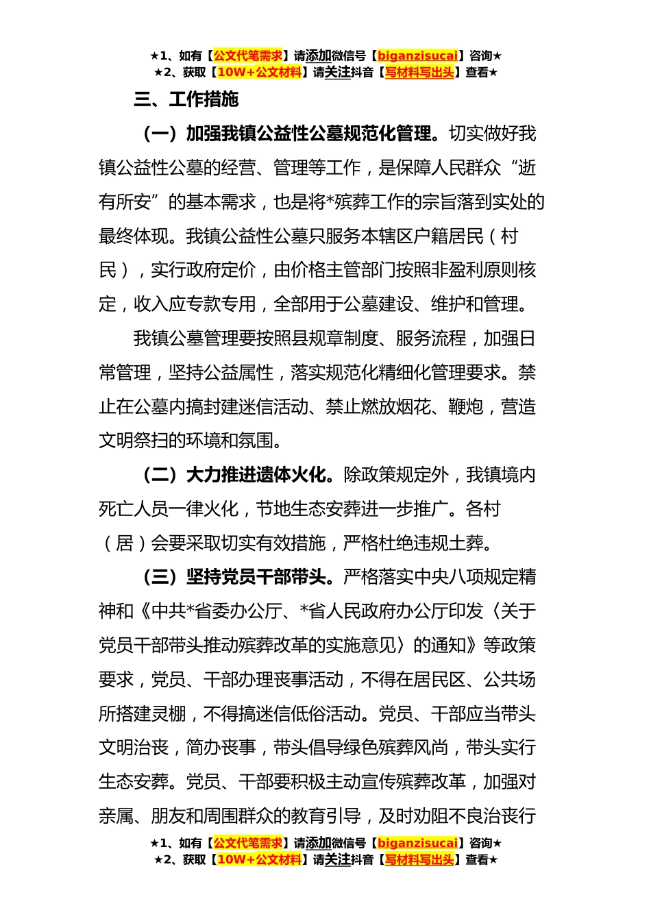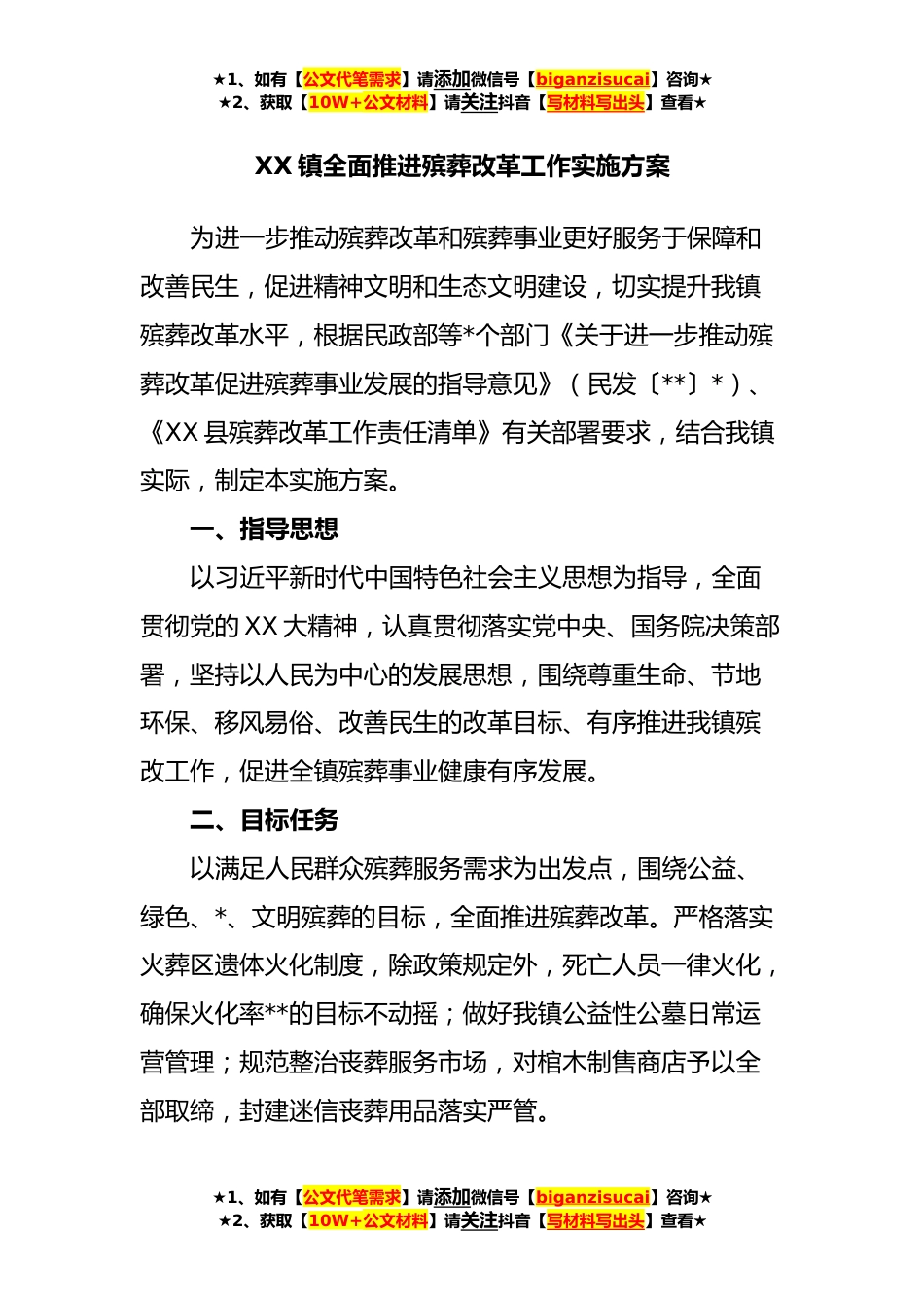 ★1、如有【公文代笔需求】请添加微信号【biganzisucai】咨询★★2、获取【10W+公文材料】请关注抖音【写材料写出头】查看★XX镇全面推进殡葬改革工作实施方案为进一步推动殡葬改革和殡葬事业更好服务于保障和改善民生,促进精神文明和生态文明建设,切实提升我镇殡葬改革水平,根据民政部等*个部门《关于进一步推动殡葬改革促进殡葬事业发展的指导意见》(民发〔**〕*)、《XX县殡葬改革工作责任清单》有关部署要求,结合我镇实际,制定本实施方案。一、指导思想以习近平新时代中国特色社会主义思想为指导,全面贯彻党的XX大精神,认真贯彻落实党中央、国务院决策部署,坚持以人民为中心的发展思想,围绕尊重生命、节地环保、移风易俗、改善民生的改革目标、有序推进我镇殡改工作,促进全镇殡葬事业健康有序发展...