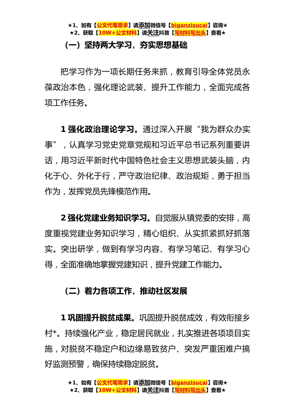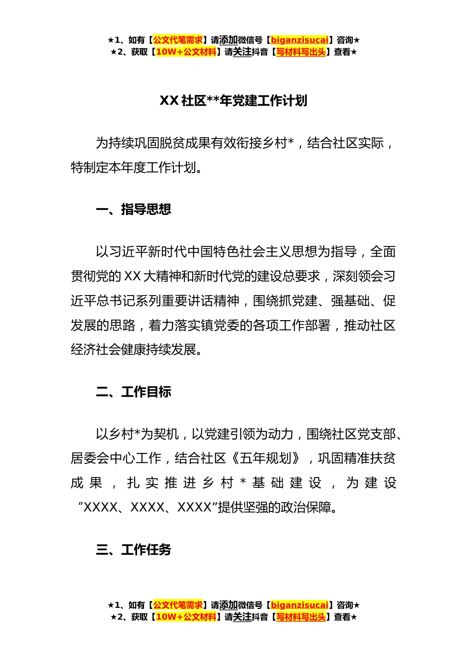 ★1、如有【公文代笔需求】请添加微信号【biganzisucai】咨询★★2、获取【10W+公文材料】请关注抖音【写材料写出头】查看★XX社区**年党建工作计划为持续巩固脱贫成果有效衔接乡村*,结合社区实际,特制定本年度工作计划。一、指导思想以习近平新时代中国特色社会主义思想为指导,全面贯彻党的XX大精神和新时代党的建设总要求,深刻领会习近平总书记系列重要讲话精神,围绕抓党建、强基础、促发展的思路,着力落实镇党委的各项工作部署,推动社区经济社会健康持续发展。二、工作目标以乡村*为契机,以党建引领为动力,围绕社区党支部、居委会中心工作,结合社区《五年规划》,巩固精准扶贫成果,扎实推进乡村*基础建设,为建设“XXXX、XXXX、XXXX”提供坚强的政治保障。三、工作任务★1、如有【公文代笔需求】请...