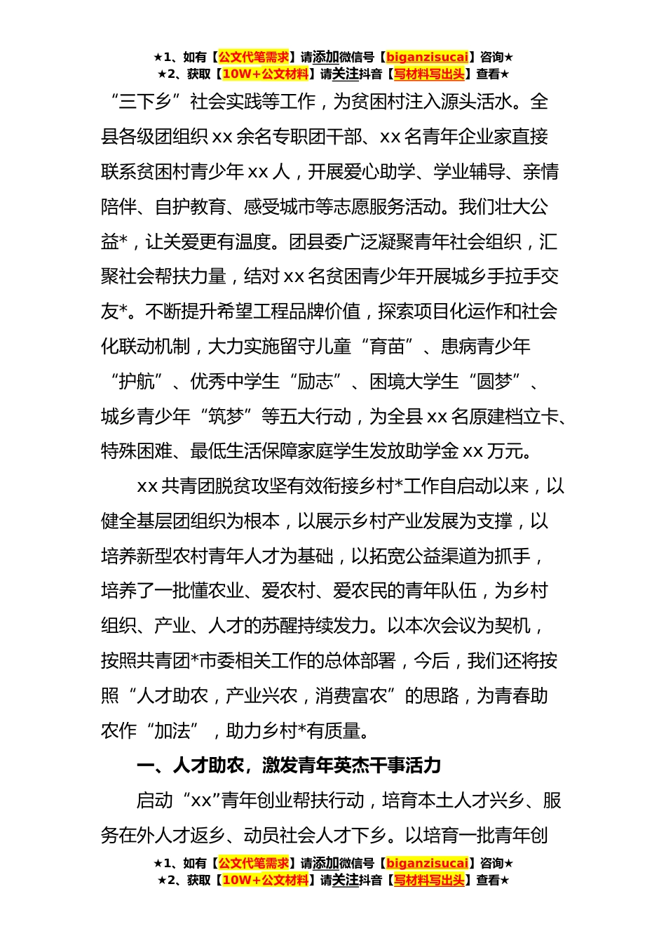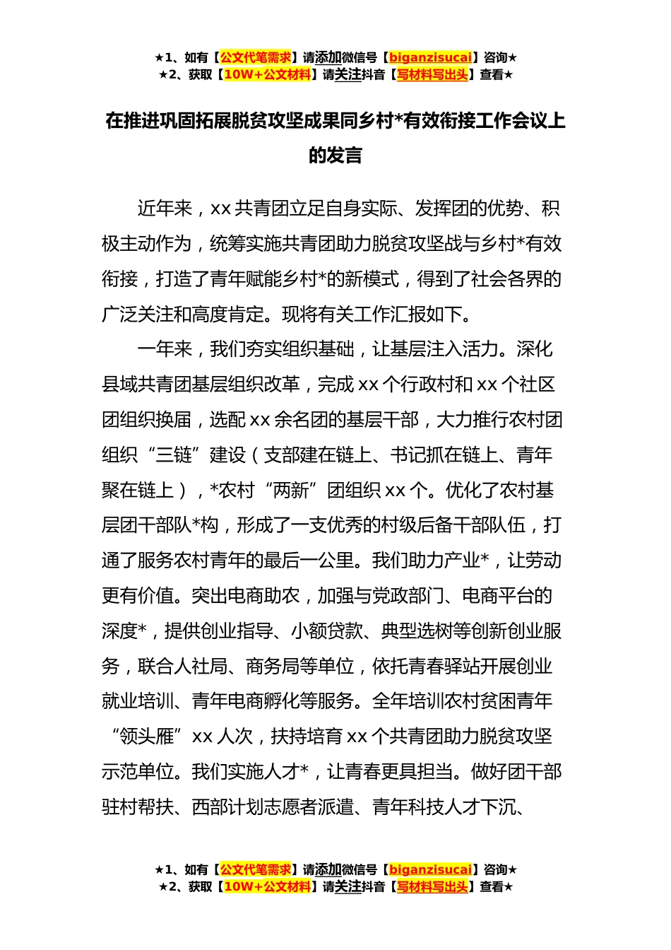 ★1、如有【公文代笔需求】请添加微信号【biganzisucai】咨询★★2、获取【10W+公文材料】请关注抖音【写材料写出头】查看★在推进巩固拓展脱贫攻坚成果同乡村*有效衔接工作会议上的发言近年来,xx共青团立足自身实际、发挥团的优势、积极主动作为,统筹实施共青团助力脱贫攻坚战与乡村*有效衔接,打造了青年赋能乡村*的新模式,得到了社会各界的广泛关注和高度肯定。现将有关工作汇报如下。一年来,我们夯实组织基础,让基层注入活力。深化县域共青团基层组织改革,完成xx个行政村和xx个社区团组织换届,选配xx余名团的基层干部,大力推行农村团组织“三链”建设(支部建在链上、书记抓在链上、青年聚在链上),*农村“两新”团组织xx个。优化了农村基层团干部队*构,形成了一支优秀的村级后备干部队伍,打通了服...