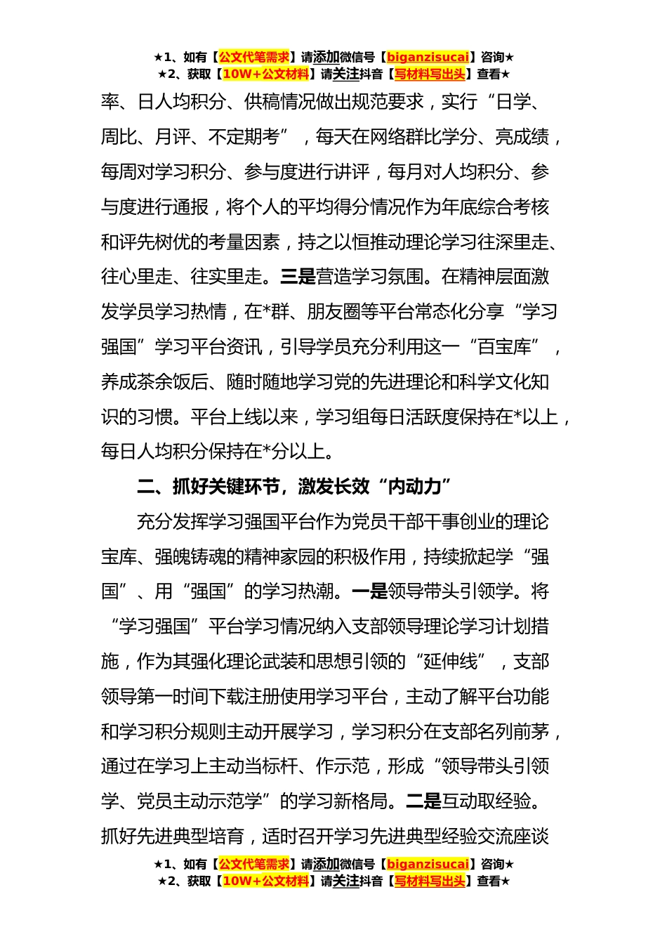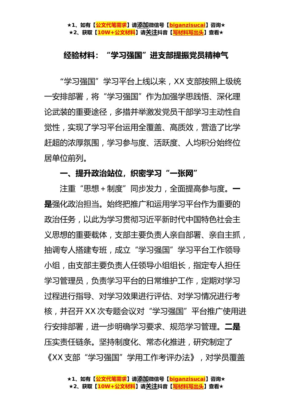 ★1、如有【公文代笔需求】请添加微信号【biganzisucai】咨询★★2、获取【10W+公文材料】请关注抖音【写材料写出头】查看★经验材料:“学习强国”进支部提振党员精神气“学习强国”学习平台上线以来,XX支部按照上级统一安排部署,将“学习强国”作为加强学思践悟、深化理论武装的重要途径,多措并举激发党员干部学习主动性自觉性,实现了学习平台运用全覆盖、高质效,营造了比学赶超的浓厚氛围,学习参与度、活跃度、人均积分始终位居单位前列。一、提升政治站位,织密学习“一张网”注重“思想+制度”同步发力,全面提高参与度。一是强化政治担当。始终把推广和运用学习平台作为重要的政治任务,以此为学习贯彻习近平新时代中国特色社会主义思想的重要载体,支部主要负责人亲自部署、亲自主抓,抽调专人搭建...