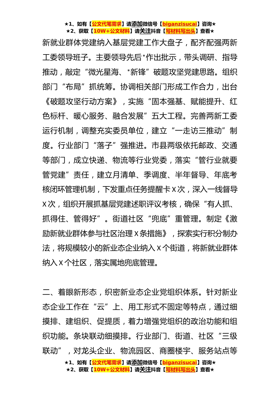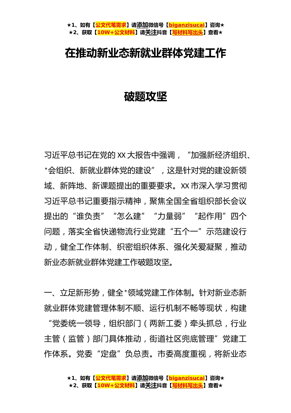 ★1、如有【公文代笔需求】请添加微信号【biganzisucai】咨询★★2、获取【10W+公文材料】请关注抖音【写材料写出头】查看★在推动新业态新就业群体党建工作破题攻坚习近平总书记在党的XX大报告中强调,“加强新经济组织、*会组织、新就业群体党的建设”,这是针对党的建设新领域、新阵地、新课题提出的重要要求。XX市深入学习贯彻习近平总书记重要指示精神,聚焦全国全省组织部长会议提出的“谁负责”“怎么建”“力量弱”“起作用”四个问题,落实全省快递物流行业党建“五个一”示范建设行动,健全工作体制、织密组织体系、强化关爱凝聚,推动新业态新就业群体党建工作破题攻坚。一、立足新形势,健全*领域党建工作体制。针对新业态新就业群体党建管理体制不顺、运行机制不畅等现状,构建“党委统一领导,组织...
