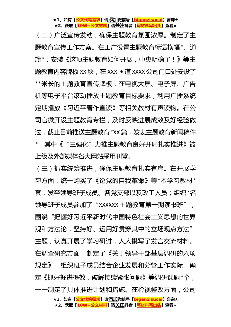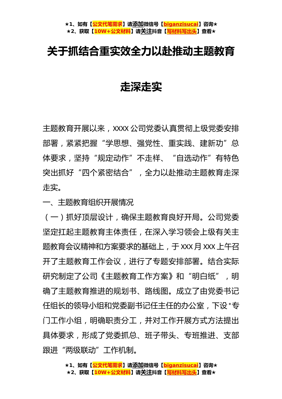 ★1、如有【公文代笔需求】请添加微信号【biganzisucai】咨询★★2、获取【10W+公文材料】请关注抖音【写材料写出头】查看★关于抓结合重实效全力以赴推动主题教育走深走实主题教育开展以来,XXXX公司党委认真贯彻上级党委安排部署,紧紧把握“学思想、强党性、重实践、建新功”总体要求,坚持“规定动作”不走样、“自选动作”有特色突出抓好“四个紧密结合”,全力以赴推动主题教育走深走实。一、主题教育组织开展情况(一)抓好顶层设计,确保主题教育良好开局。公司党委坚定扛起主题教育主体责任,在深入学习领会上级有关主题教育会议精神和方案要求的基础上,于XXX月XXX上午召开了主题教育工作会议,进行了专题安排部署。结合实际研究制定了公司《主题教育工作方案》和“明白纸”,明确了主题教育推进的规划...