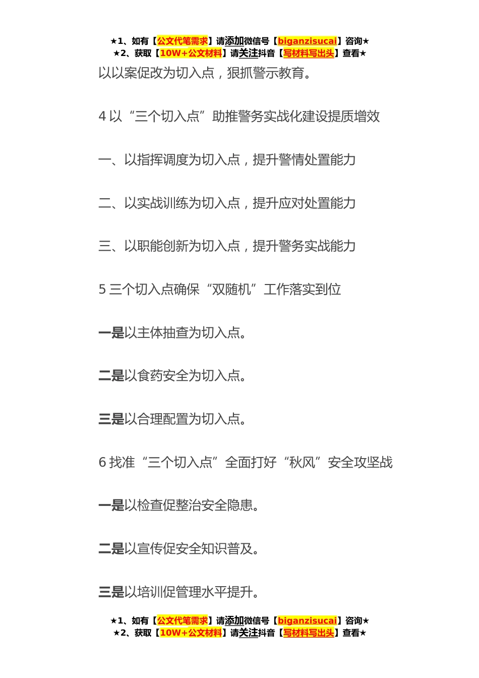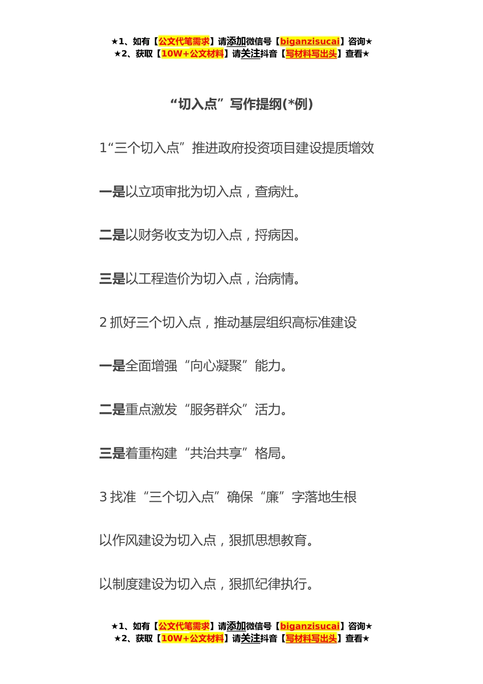 ★1、如有【公文代笔需求】请添加微信号【biganzisucai】咨询★★2、获取【10W+公文材料】请关注抖音【写材料写出头】查看★“切入点”写作提纲(*例)1“三个切入点”推进政府投资项目建设提质增效一是以立项审批为切入点,查病灶。二是以财务收支为切入点,捋病因。三是以工程造价为切入点,治病情。2抓好三个切入点,推动基层组织高标准建设一是全面增强“向心凝聚”能力。二是重点激发“服务群众”活力。三是着重构建“共治共享”格局。3找准“三个切入点”确保“廉”字落地生根以作风建设为切入点,狠抓思想教育。以制度建设为切入点,狠抓纪律执行。★1、如有【公文代笔需求】请添加微信号【biganzisucai】咨询★★2、获取【10W+公文材料】请关注抖音【写材料写出头】查看★★1、如有【公文代笔需求】请添加微...