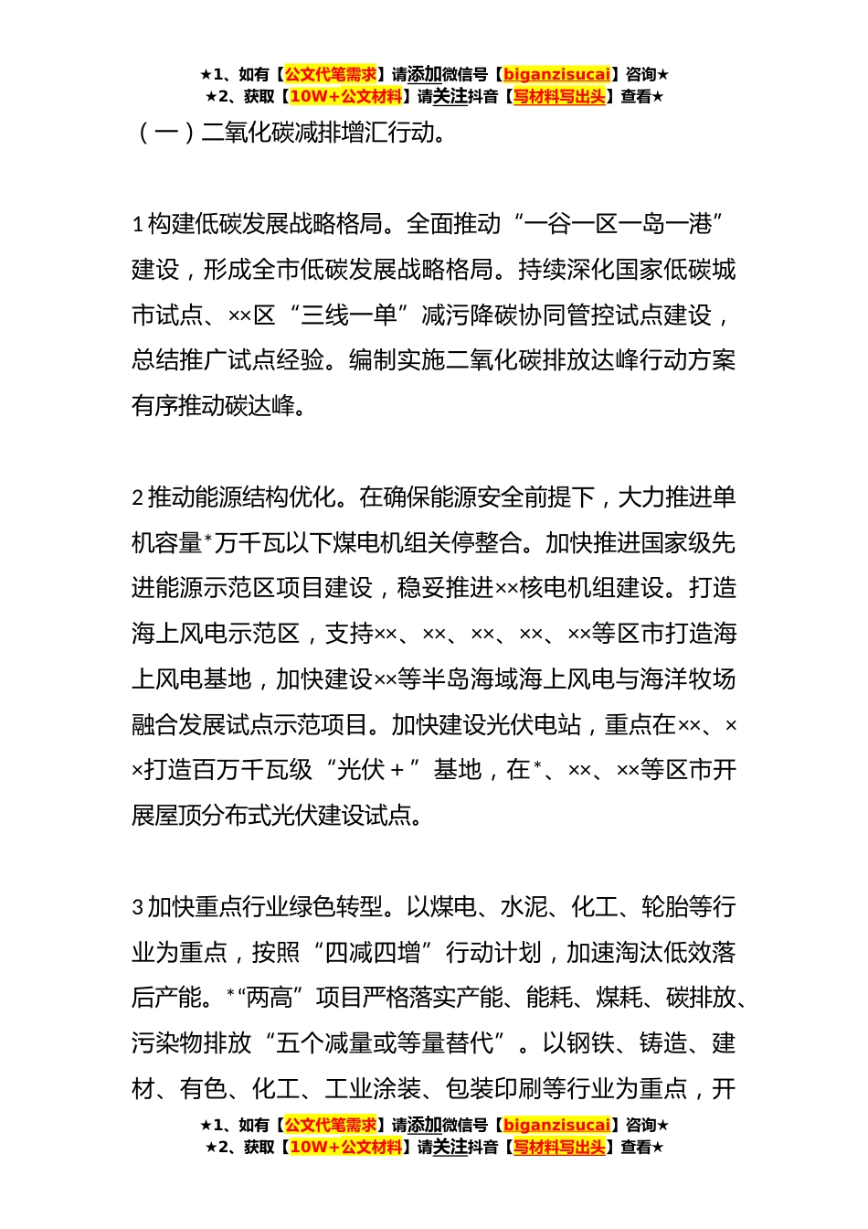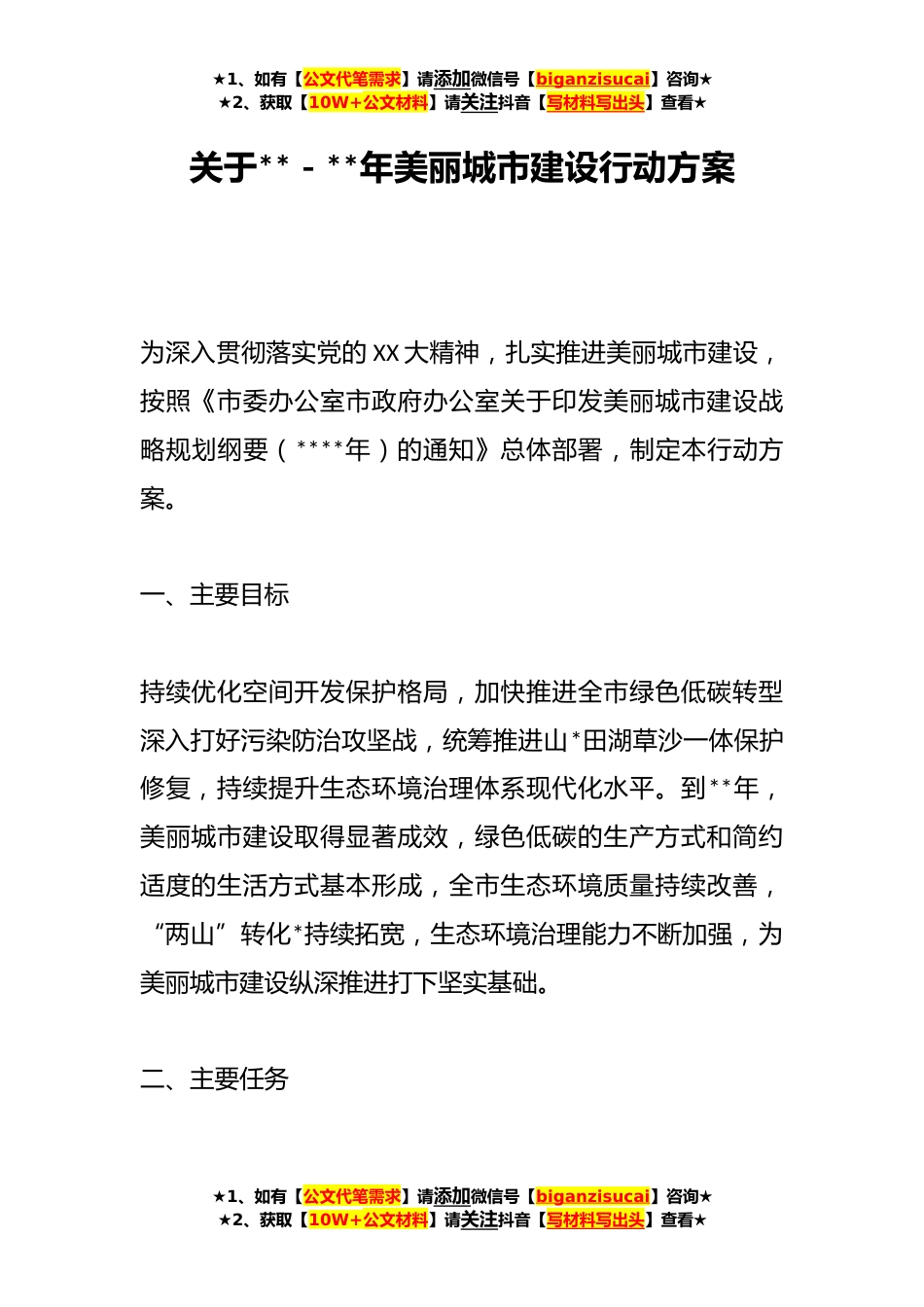 ★1、如有【公文代笔需求】请添加微信号【biganzisucai】咨询★★2、获取【10W+公文材料】请关注抖音【写材料写出头】查看★关于**-**年美丽城市建设行动方案为深入贯彻落实党的XX大精神,扎实推进美丽城市建设,按照《市委办公室市政府办公室关于印发美丽城市建设战略规划纲要(****年)的通知》总体部署,制定本行动方案。一、主要目标持续优化空间开发保护格局,加快推进全市绿色低碳转型深入打好污染防治攻坚战,统筹推进山*田湖草沙一体保护修复,持续提升生态环境治理体系现代化水平。到**年,美丽城市建设取得显著成效,绿色低碳的生产方式和简约适度的生活方式基本形成,全市生态环境质量持续改善,“两山”转化*持续拓宽,生态环境治理能力不断加强,为美丽城市建设纵深推进打下坚实基础。二、主要任务...