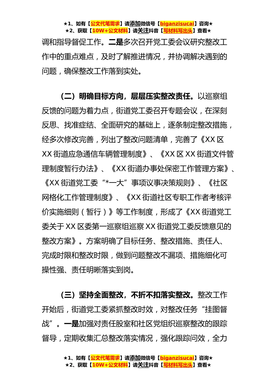 ★1、如有【公文代笔需求】请添加微信号【biganzisucai】咨询★★2、获取【10W+公文材料】请关注抖音【写材料写出头】查看★XX街道党工委巡察整改工作情况报告按照XX区委统一安排部署,**年X月*至X月*,区委第一巡察组对XX街道党工委进行了巡察,并于**年XX月*日向XX街道党工委反馈了巡察意见。根据《中国共产党巡视工作条例》和巡察工作有关要求,现将巡察整改情况予以公布:一、直面问题,强化责任,把巡察整改作为重要政治任务抓紧抓实抓好街道党工委切实落实整改主体责任,以巡察整改工作的实效推动建章立制,真抓实改,确保整改工作取得实效,提高全面从严治党的政治自觉性,推进各项工作扎实开展。(一)强化组织领导,确保整改有条不紊。区委第一巡察组反馈意见后,街道党工委坚决扛起巡察整改政治责任,以...