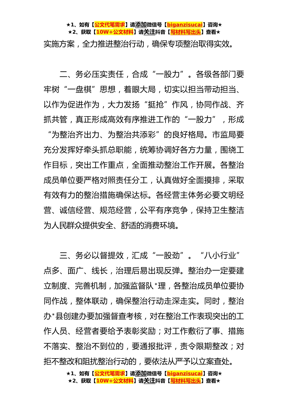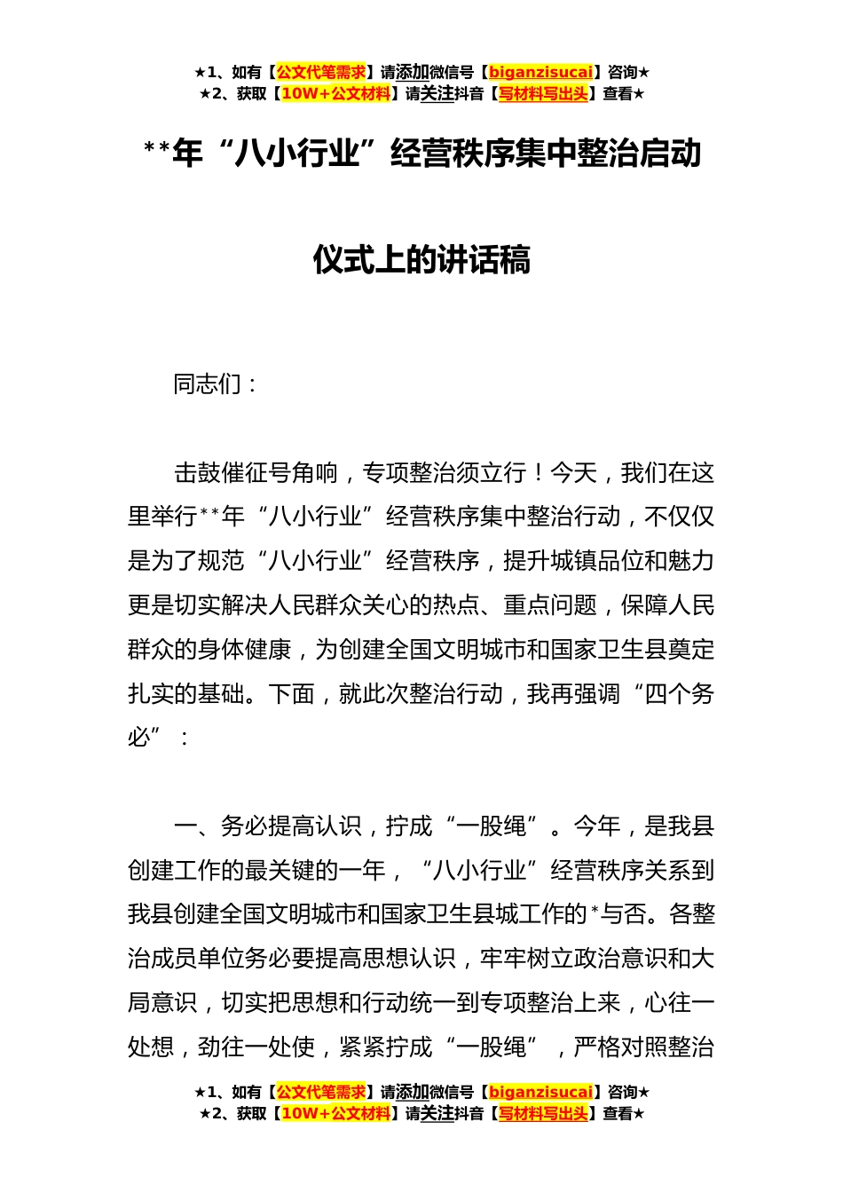 ★1、如有【公文代笔需求】请添加微信号【biganzisucai】咨询★★2、获取【10W+公文材料】请关注抖音【写材料写出头】查看★**年“八小行业”经营秩序集中整治启动仪式上的讲话稿同志们:击鼓催征号角响,专项整治须立行!今天,我们在这里举行**年“八小行业”经营秩序集中整治行动,不仅仅是为了规范“八小行业”经营秩序,提升城镇品位和魅力更是切实解决人民群众关心的热点、重点问题,保障人民群众的身体健康,为创建全国文明城市和国家卫生县奠定扎实的基础。下面,就此次整治行动,我再强调“四个务必”:一、务必提高认识,拧成“一股绳”。今年,是我县创建工作的最关键的一年,“八小行业”经营秩序关系到我县创建全国文明城市和国家卫生县城工作的*与否。各整治成员单位务必要提高思想认识,牢牢树立政...