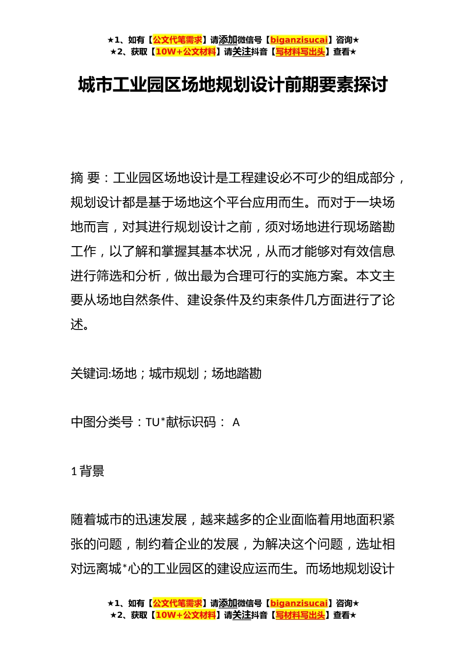 ★1、如有【公文代笔需求】请添加微信号【biganzisucai】咨询★★2、获取【10W+公文材料】请关注抖音【写材料写出头】查看★城市工业园区场地规划设计前期要素探讨摘要:工业园区场地设计是工程建设必不可少的组成部分,规划设计都是基于场地这个平台应用而生。而对于一块场地而言,对其进行规划设计之前,须对场地进行现场踏勘工作,以了解和掌握其基本状况,从而才能够对有效信息进行筛选和分析,做出最为合理可行的实施方案。本文主要从场地自然条件、建设条件及约束条件几方面进行了论述。关键词:场地;城市规划;场地踏勘中图分类号:TU*献标识码:A1背景随着城市的迅速发展,越来越多的企业面临着用地面积紧张的问题,制约着企业的发展,为解决这个问题,选址相对远离城*心的工业园区的建设应运而生。而场地...