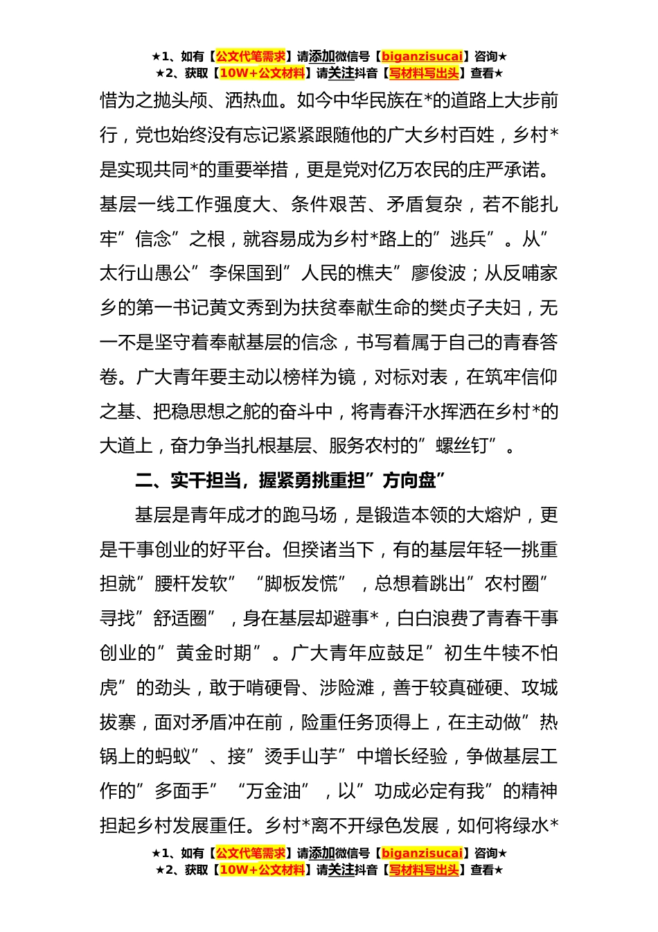 ★1、如有【公文代笔需求】请添加微信号【biganzisucai】咨询★★2、获取【10W+公文材料】请关注抖音【写材料写出头】查看★交流研讨发言:践行回信精神助力乡村*用青春书写新时代华彩篇章近日,习近平总书记给中国农业大学科技小院的同学们回信时强调,”你们在信中说,走进乡土中国深处,才深刻理解什么是实事求是、怎么去联系群众,青年人就要”自找苦吃”,说得很好。新时代中国青年就应该有这股精气神。党的XX大对建设农业强国作出部署,希望同学们志存高远、脚踏实地,把课堂学习和乡村实践紧密结合起来,厚植爱农情怀,练就兴农本领,在乡村*的大舞台上建功立业,为加快推进农业农村现代化、全面建设社会主义现代化国家贡献青春力量。”习近平总书记高瞻远瞩,始终心怀青年,也始终心系祖国基层农村建设,...