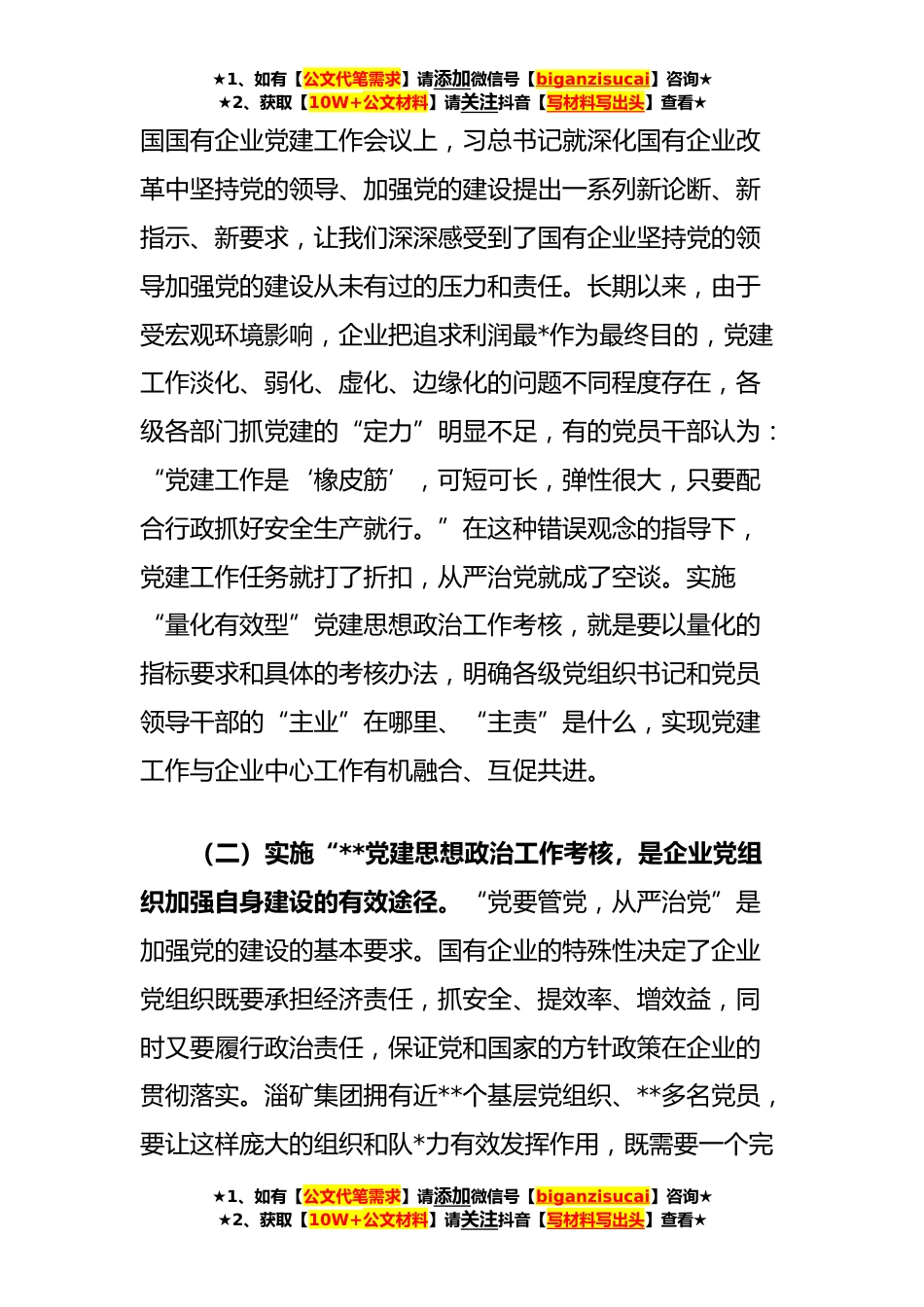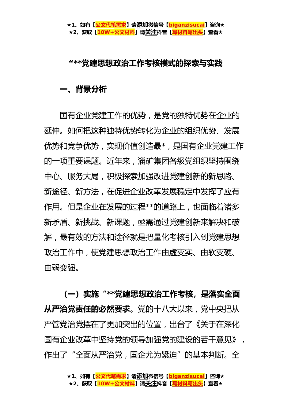 ★1、如有【公文代笔需求】请添加微信号【biganzisucai】咨询★★2、获取【10W+公文材料】请关注抖音【写材料写出头】查看★“**党建思想政治工作考核模式的探索与实践一、背景分析国有企业党建工作的优势,是党的独特优势在企业的延伸。如何把这种独特优势转化为企业的组织优势、发展优势和竞争优势,实现价值创造最*,是国有企业党建工作的一项重要课题。近年来,淄矿集团各级党组织坚持围绕中心、服务大局,积极探索加强改进党建创新的新思路、新途径、新方法,在促进企业改革发展稳定中发挥了应有作用。但是企业在发展的过程**的道路上,也面临着诸多新矛盾、新挑战、新课题,亟需通过党建创新来解决和破解,最有效的方法和途径就是把量化考核引入到党建思想政治工作中,使党建思想政治工作由虚变实、由软变硬...