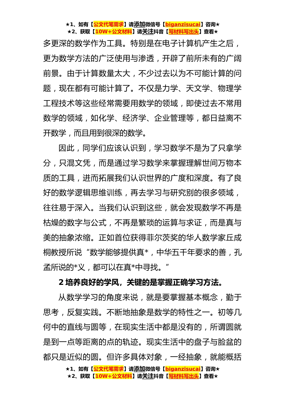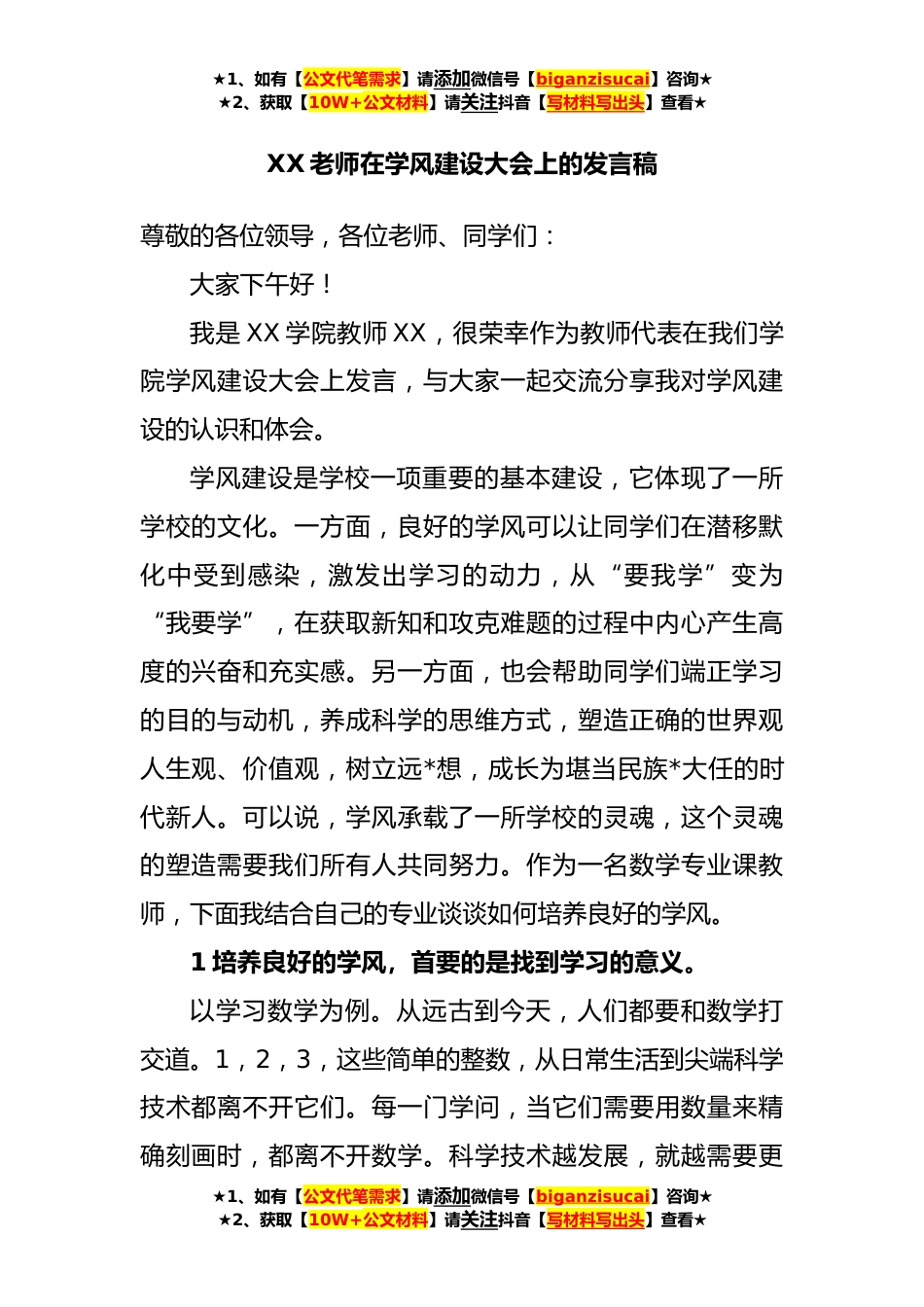 ★1、如有【公文代笔需求】请添加微信号【biganzisucai】咨询★★2、获取【10W+公文材料】请关注抖音【写材料写出头】查看★XX老师在学风建设大会上的发言稿尊敬的各位领导,各位老师、同学们:大家下午好!我是XX学院教师XX,很荣幸作为教师代表在我们学院学风建设大会上发言,与大家一起交流分享我对学风建设的认识和体会。学风建设是学校一项重要的基本建设,它体现了一所学校的文化。一方面,良好的学风可以让同学们在潜移默化中受到感染,激发出学习的动力,从“要我学”变为“我要学”,在获取新知和攻克难题的过程中内心产生高度的兴奋和充实感。另一方面,也会帮助同学们端正学习的目的与动机,养成科学的思维方式,塑造正确的世界观人生观、价值观,树立远*想,成长为堪当民族*大任的时代新人。可以说,...