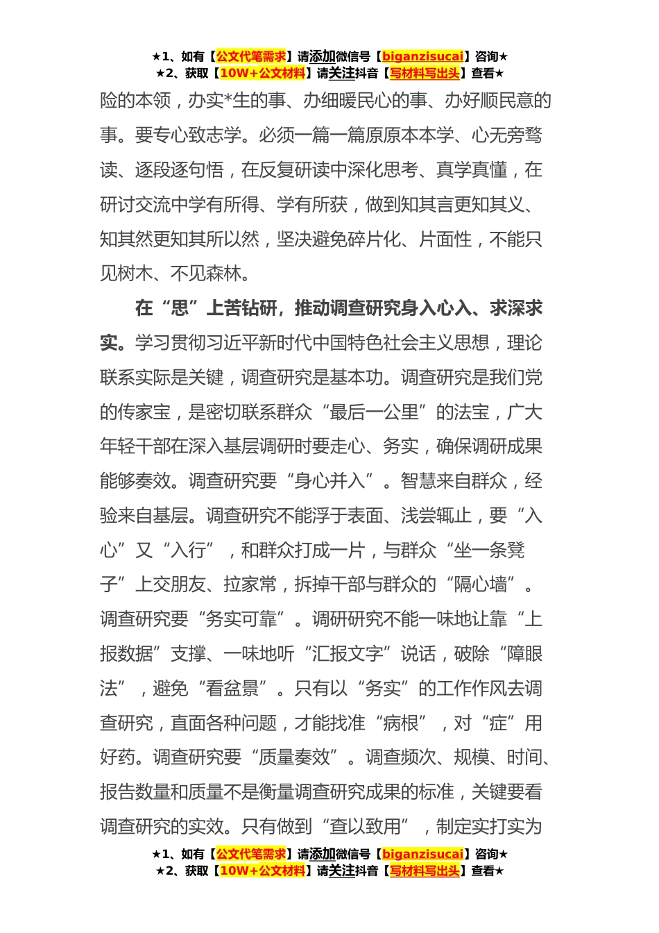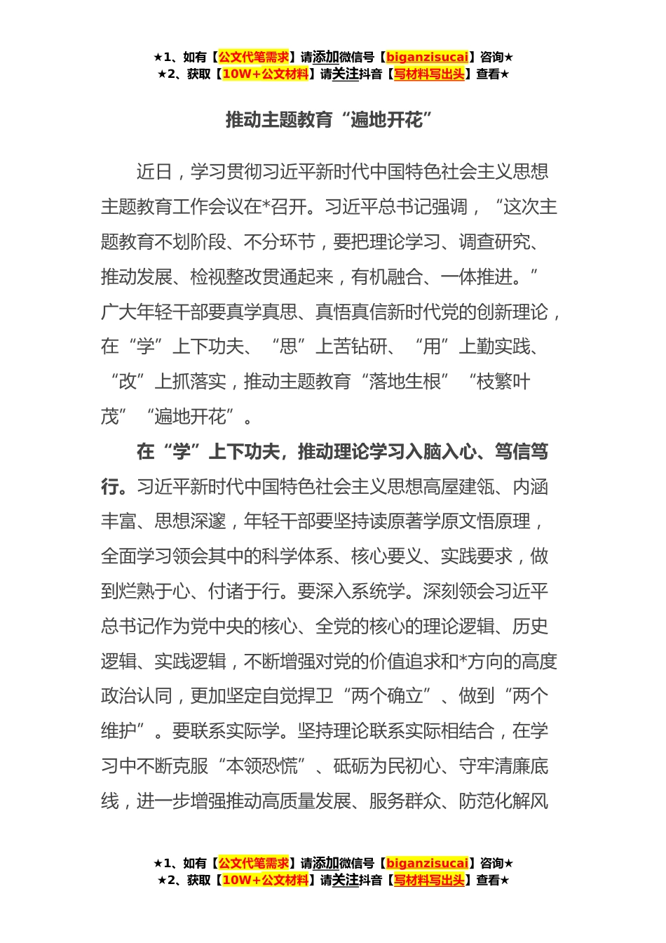 ★1、如有【公文代笔需求】请添加微信号【biganzisucai】咨询★★2、获取【10W+公文材料】请关注抖音【写材料写出头】查看★推动主题教育“遍地开花”近日,学习贯彻习近平新时代中国特色社会主义思想主题教育工作会议在*召开。习近平总书记强调,“这次主题教育不划阶段、不分环节,要把理论学习、调查研究、推动发展、检视整改贯通起来,有机融合、一体推进。”广大年轻干部要真学真思、真悟真信新时代党的创新理论,在“学”上下功夫、“思”上苦钻研、“用”上勤实践、“改”上抓落实,推动主题教育“落地生根”“枝繁叶茂”“遍地开花”。在“学”上下功夫,推动理论学习入脑入心、笃信笃行。习近平新时代中国特色社会主义思想高屋建瓴、内涵丰富、思想深邃,年轻干部要坚持读原著学原文悟原理,全面学习领会...