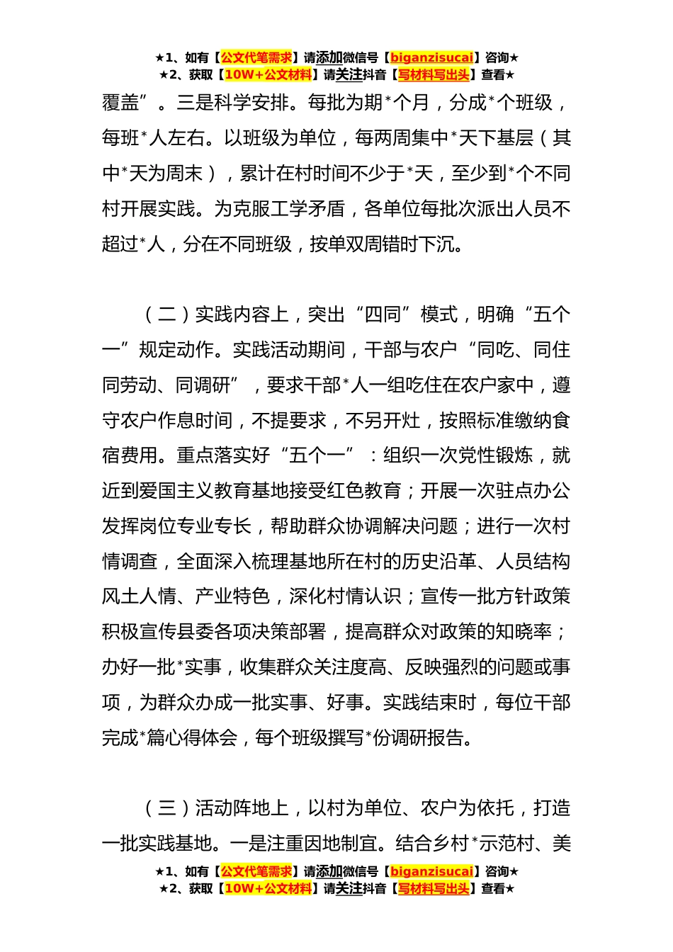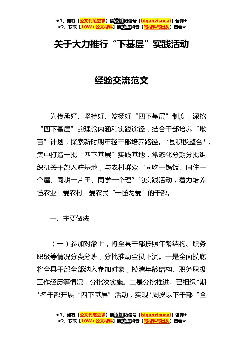 ★1、如有【公文代笔需求】请添加微信号【biganzisucai】咨询★★2、获取【10W+公文材料】请关注抖音【写材料写出头】查看★关于大力推行“下基层”实践活动经验交流范文为传承好、坚持好、发扬好“四下基层”制度,深挖“四下基层”的理论内涵和实践途径,结合干部培养“墩苗”计划,探索新时期年轻干部培养路径。*县积极整合*,集中打造一批“四下基层”实践基地,常态化分期分批组织机关干部入驻基地,与农村群众“同吃一锅饭、同住一个屋、同耕一片田、同学一个理”的实践活动,着力培养懂农业、爱农村、爱农民“一懂两爱”的干部。一、主要做法(一)参加对象上,将全县干部按照年龄结构、职务职级等情况分类分班,分批推动全员下沉。一是全面摸底将全县干部全部纳入参加对象,摸清年龄结构、职务职级工作经...