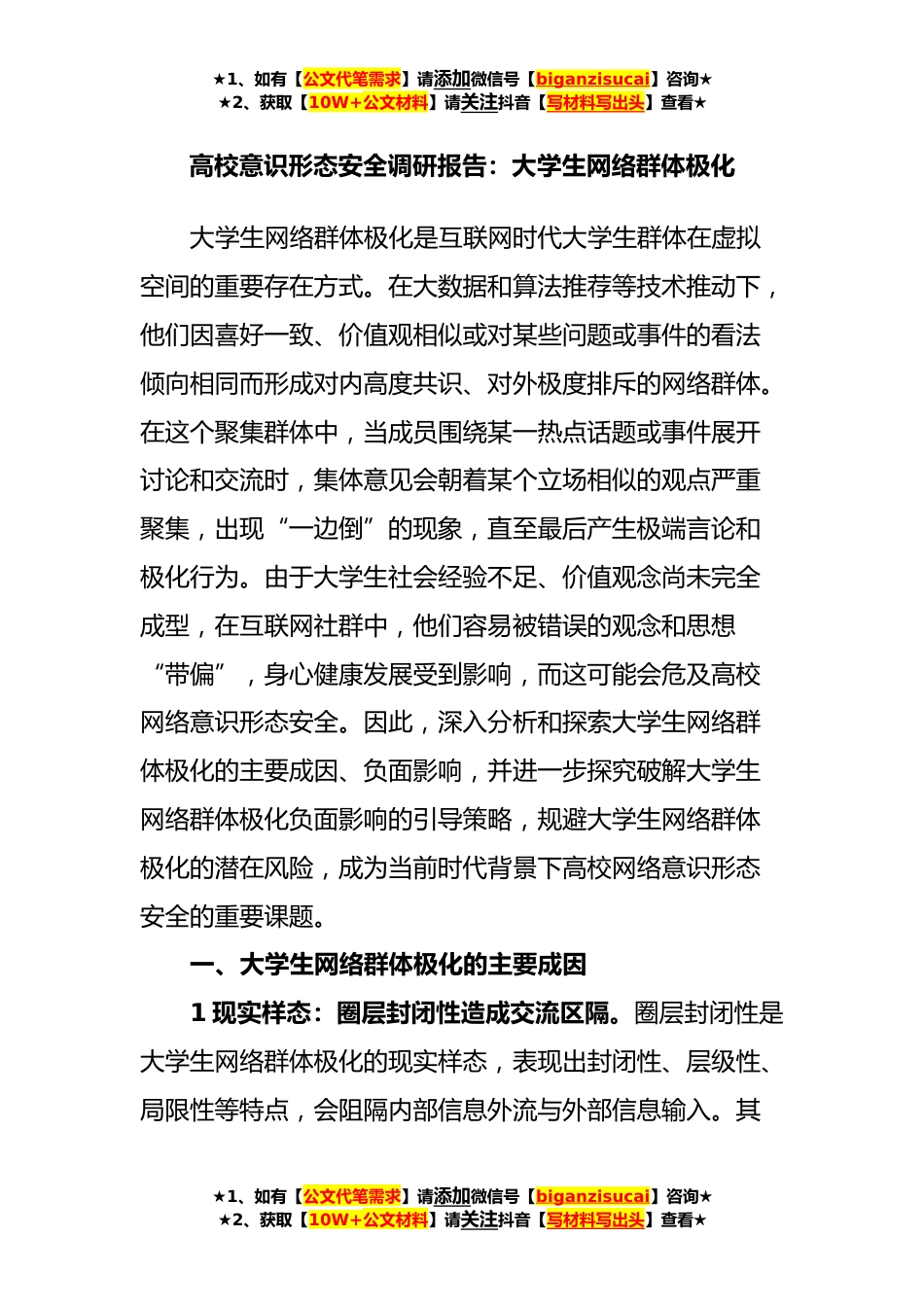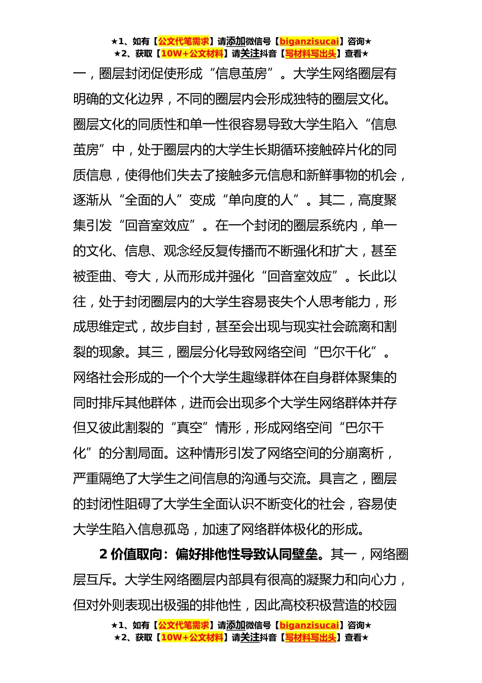 ★1、如有【公文代笔需求】请添加微信号【biganzisucai】咨询★★2、获取【10W+公文材料】请关注抖音【写材料写出头】查看★高校意识形态安全调研报告:大学生网络群体极化大学生网络群体极化是互联网时代大学生群体在虚拟空间的重要存在方式。在大数据和算法推荐等技术推动下,他们因喜好一致、价值观相似或对某些问题或事件的看法倾向相同而形成对内高度共识、对外极度排斥的网络群体。在这个聚集群体中,当成员围绕某一热点话题或事件展开讨论和交流时,集体意见会朝着某个立场相似的观点严重聚集,出现“一边倒”的现象,直至最后产生极端言论和极化行为。由于大学生社会经验不足、价值观念尚未完全成型,在互联网社群中,他们容易被错误的观念和思想“带偏”,身心健康发展受到影响,而这可能会危及高校网络...