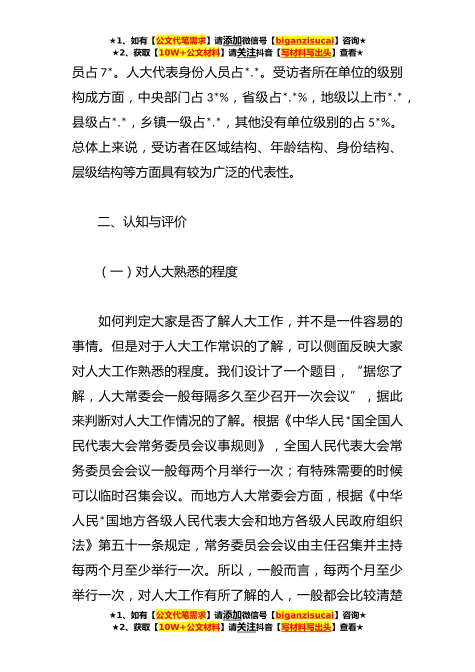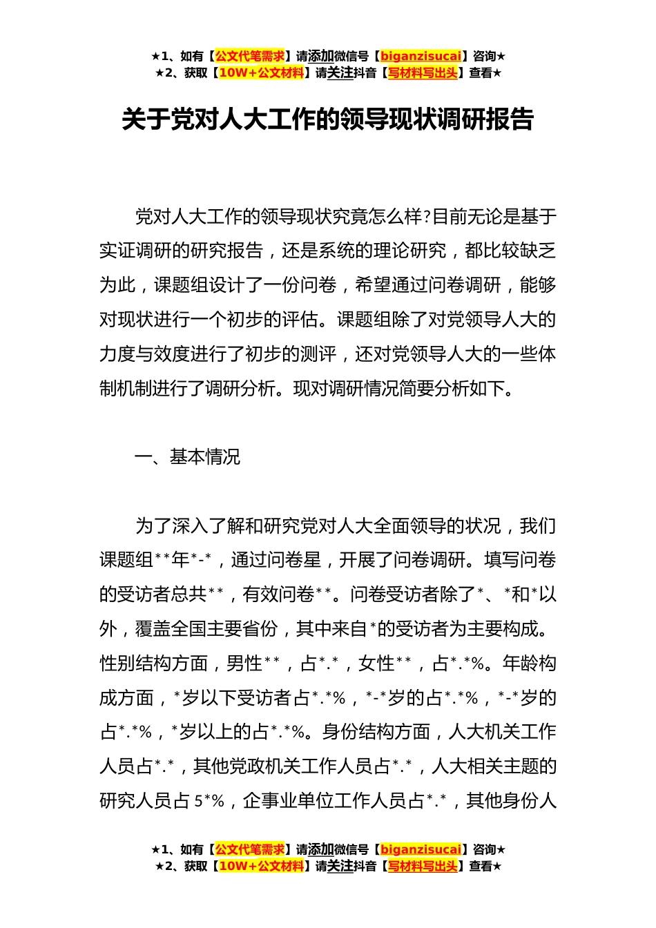 ★1、如有【公文代笔需求】请添加微信号【biganzisucai】咨询★★2、获取【10W+公文材料】请关注抖音【写材料写出头】查看★关于党对人大工作的领导现状调研报告党对人大工作的领导现状究竟怎么样?目前无论是基于实证调研的研究报告,还是系统的理论研究,都比较缺乏为此,课题组设计了一份问卷,希望通过问卷调研,能够对现状进行一个初步的评估。课题组除了对党领导人大的力度与效度进行了初步的测评,还对党领导人大的一些体制机制进行了调研分析。现对调研情况简要分析如下。一、基本情况为了深入了解和研究党对人大全面领导的状况,我们课题组**年*-*,通过问卷星,开展了问卷调研。填写问卷的受访者总共**,有效问卷**。问卷受访者除了*、*和*以外,覆盖全国主要省份,其中来自*的受访者为主要构成。性别结...
