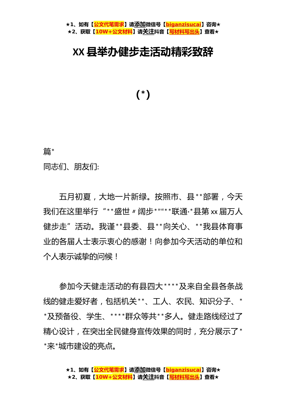 ★1、如有【公文代笔需求】请添加微信号【biganzisucai】咨询★★2、获取【10W+公文材料】请关注抖音【写材料写出头】查看★XX县举办健步走活动精彩致辞(*)篇*同志们、朋友们:五月初夏,大地一片新绿。按照市、县**部署,今天我们在这里举行“**盛世〃阔步*”“**联通·*县第xx届万人健步走”活动。我谨**县委、县**向关心、**我县体育事业的各届人士表示衷心的感谢!向参加今天活动的单位和个人表示诚挚的问候!参加今天健走活动的有县四大****及来自全县各条战线的健走爱好者,包括机关**、工人、农民、知识分子、**及预备役、学生、****群众等共**多人。健走路线经过了精心设计,在突出全民健身宣传效果的同时,充分展示了**来*城市建设的亮点。★1、如有【公文代笔需求】请添加微信号【biganzisucai】咨询★...