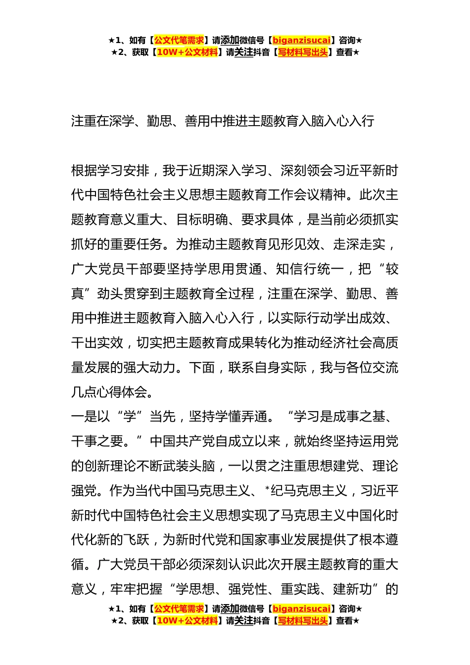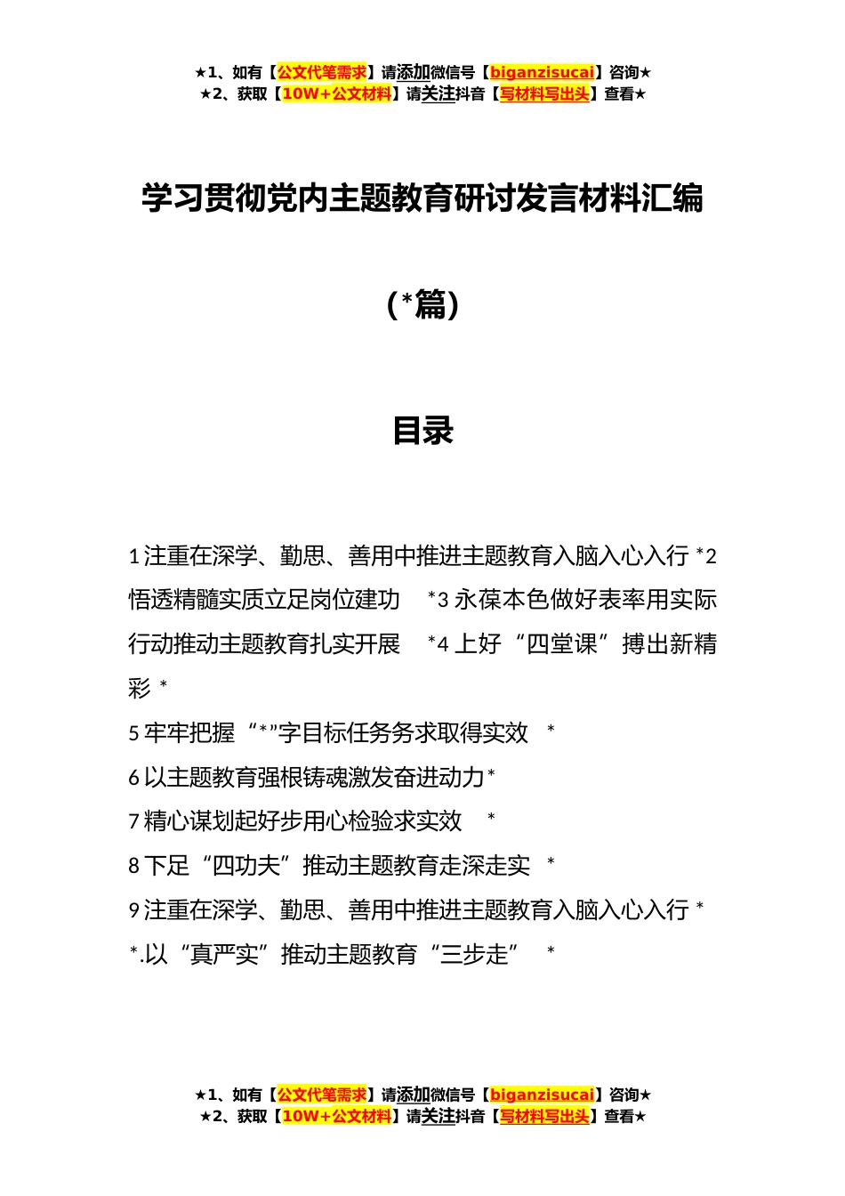 ★1、如有【公文代笔需求】请添加微信号【biganzisucai】咨询★★2、获取【10W+公文材料】请关注抖音【写材料写出头】查看★学习贯彻党内主题教育研讨发言材料汇编(*篇)目录1注重在深学、勤思、善用中推进主题教育入脑入心入行*2悟透精髓实质立足岗位建功*3永葆本色做好表率用实际行动推动主题教育扎实开展*4上好“四堂课”搏出新精彩*5牢牢把握“*”字目标任务务求取得实效*6以主题教育强根铸魂激发奋进动力*7精心谋划起好步用心检验求实效*8下足“四功夫”推动主题教育走深走实*9注重在深学、勤思、善用中推进主题教育入脑入心入行**.以“真严实”推动主题教育“三步走”*★1、如有【公文代笔需求】请添加微信号【biganzisucai】咨询★★2、获取【10W+公文材料】请关注抖音【写材料写出头】查看★★1、如有【...