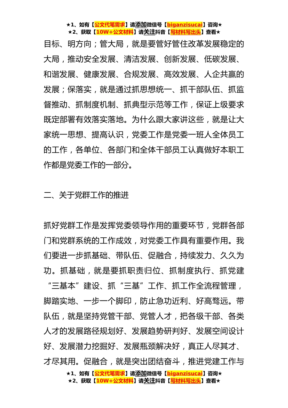 ★1、如有【公文代笔需求】请添加微信号【biganzisucai】咨询★★2、获取【10W+公文材料】请关注抖音【写材料写出头】查看★**年XX国企纪委领导党风廉政建设和反腐败工作报告同志们:按照会议安排,我代表XX纪委作党风廉政建设和反腐败工作报告。第一部分关于新一年党委工作一、关于党委领导作用的发挥《党章》第三十三条规定:国有企业党委(党组)发挥领导作用,把方向、管大局、保落实,依照规定讨论和决定企业重大事项。如何做好“把方向、管大局、保落实”,结合实际,就应该做到以下几点:把方向,就是要把准坚持党的领导、加强党的建设,认真落实党中央决策部署的政治方向,就是要把准坚决贯彻落实习近平总书记对能源保供重要指示批示精神、履行油气生产职责的企业发展方向,就是要围绕油气高质量增储上产...