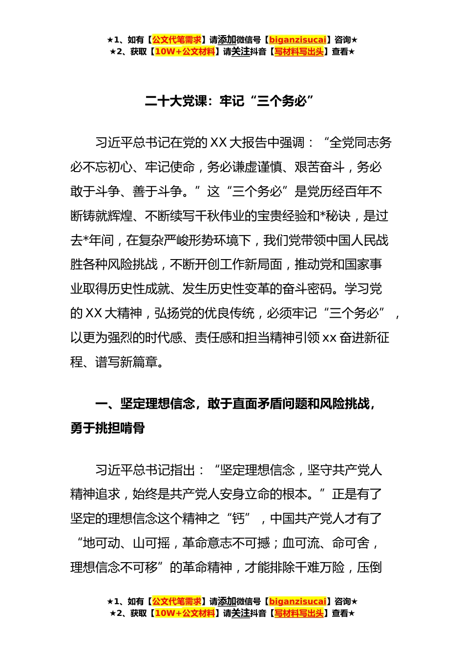 ★1、如有【公文代笔需求】请添加微信号【biganzisucai】咨询★★2、获取【10W+公文材料】请关注抖音【写材料写出头】查看★二十大党课:牢记“三个务必”习近平总书记在党的XX大报告中强调:“全党同志务必不忘初心、牢记使命,务必谦虚谨慎、艰苦奋斗,务必敢于斗争、善于斗争。”这“三个务必”是党历经百年不断铸就辉煌、不断续写千秋伟业的宝贵经验和*秘诀,是过去*年间,在复杂严峻形势环境下,我们党带领中国人民战胜各种风险挑战,不断开创工作新局面,推动党和国家事业取得历史性成就、发生历史性变革的奋斗密码。学习党的XX大精神,弘扬党的优良传统,必须牢记“三个务必”,以更为强烈的时代感、责任感和担当精神引领xx奋进新征程、谱写新篇章。一、坚定理想信念,敢于直面矛盾问题和风险挑战,勇于挑...