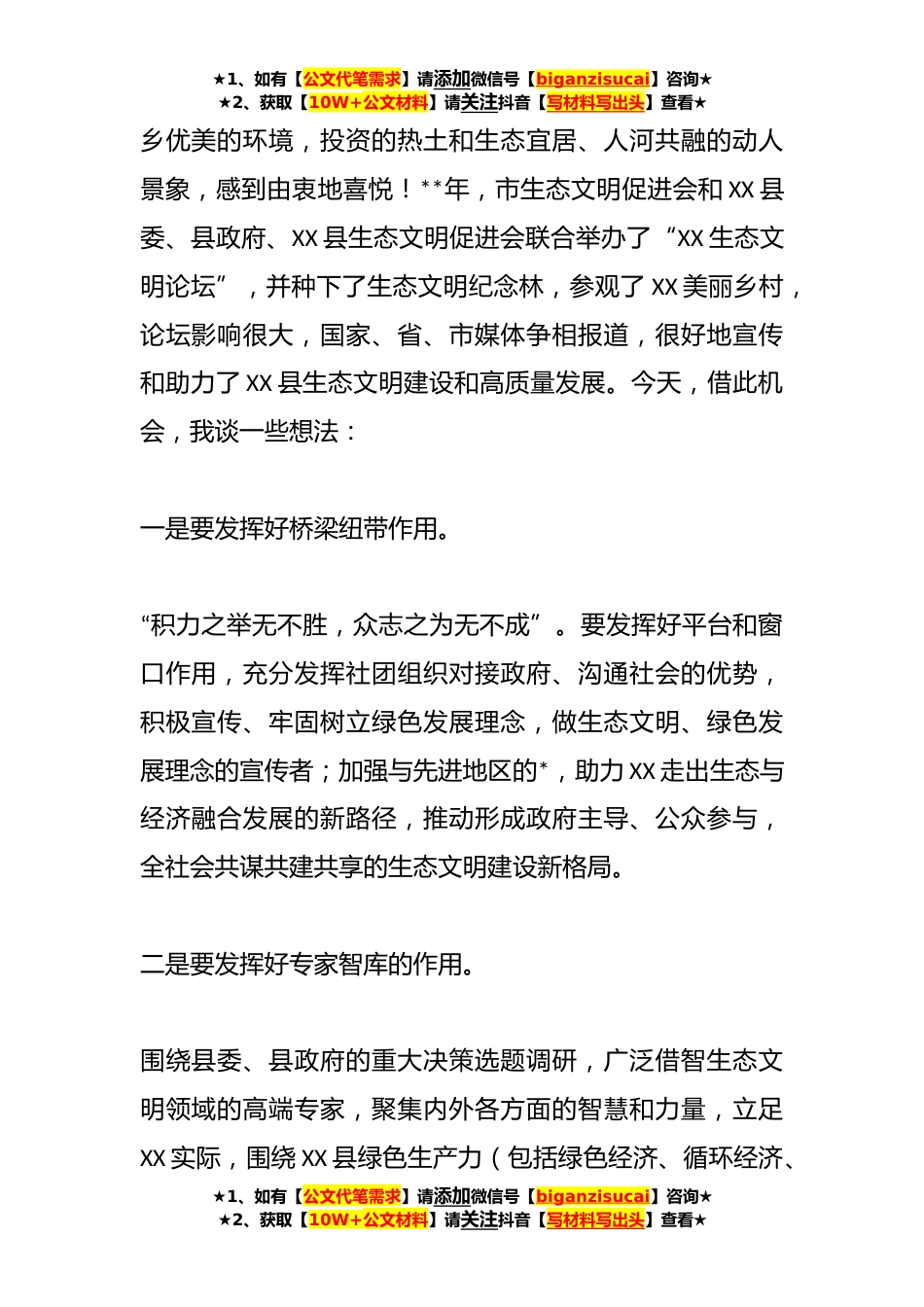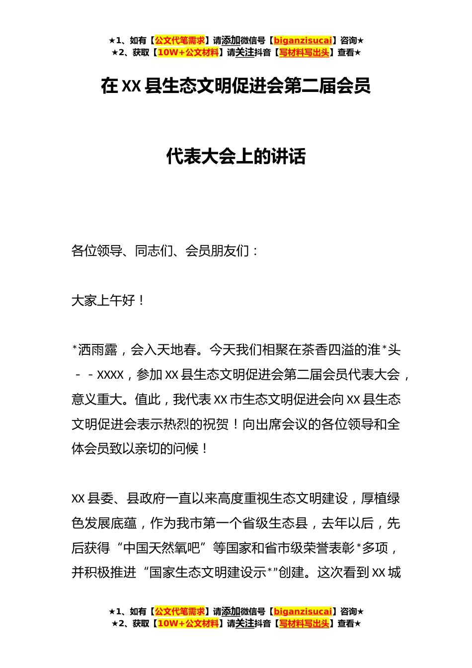★1、如有【公文代笔需求】请添加微信号【biganzisucai】咨询★★2、获取【10W+公文材料】请关注抖音【写材料写出头】查看★在XX县生态文明促进会第二届会员代表大会上的讲话各位领导、同志们、会员朋友们:大家上午好!*洒雨露,会入天地春。今天我们相聚在茶香四溢的淮*头--XXXX,参加XX县生态文明促进会第二届会员代表大会,意义重大。值此,我代表XX市生态文明促进会向XX县生态文明促进会表示热烈的祝贺!向出席会议的各位领导和全体会员致以亲切的问候!XX县委、县政府一直以来高度重视生态文明建设,厚植绿色发展底蕴,作为我市第一个省级生态县,去年以后,先后获得“中国天然氧吧”等国家和省市级荣誉表彰*多项,并积极推进“国家生态文明建设示*”创建。这次看到XX城★1、如有【公文代笔需求】请添加微...