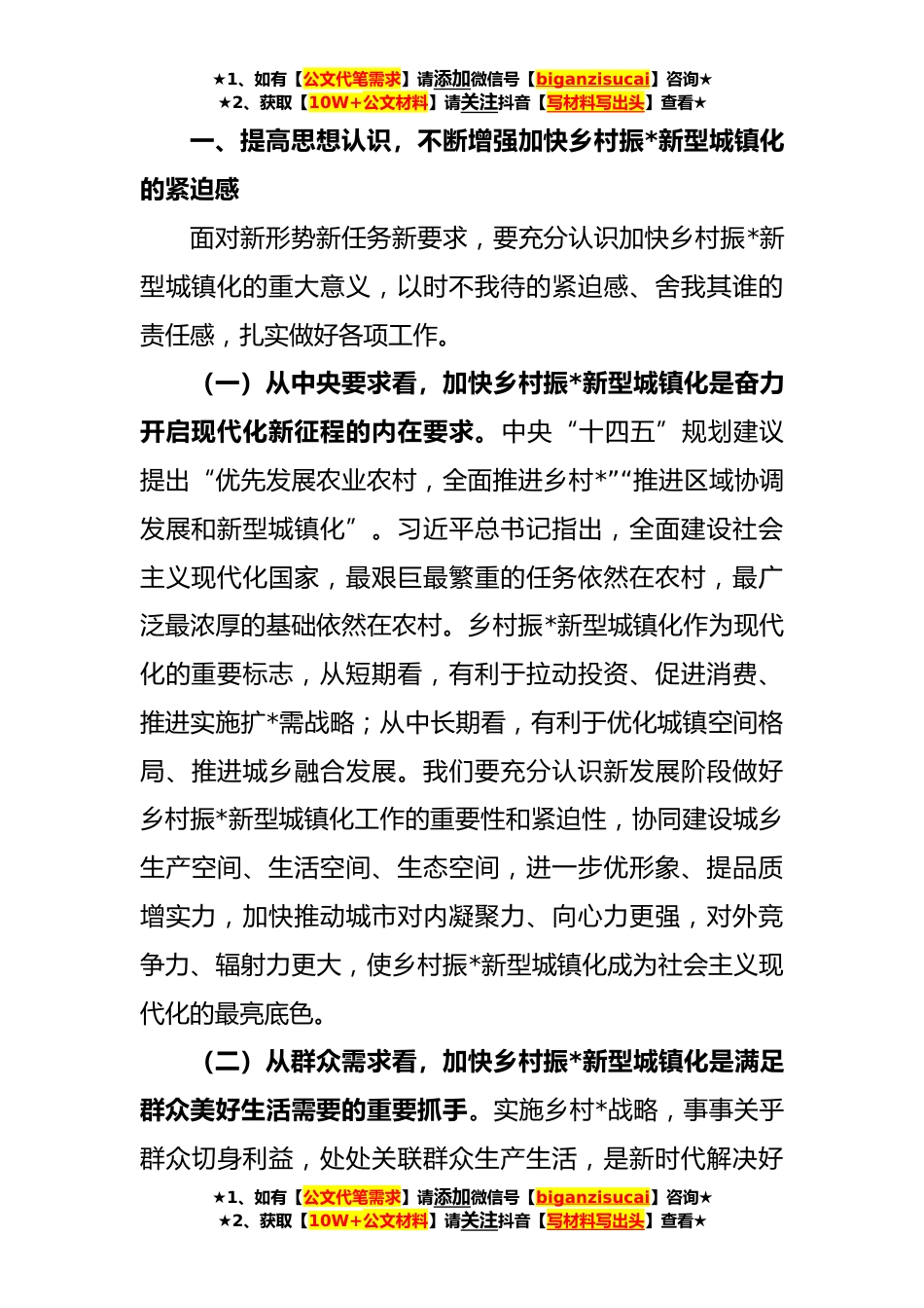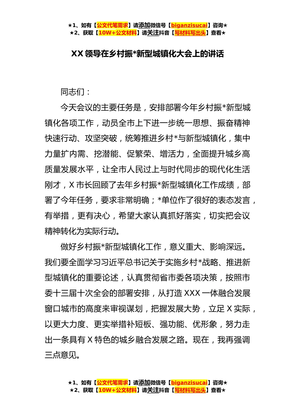 ★1、如有【公文代笔需求】请添加微信号【biganzisucai】咨询★★2、获取【10W+公文材料】请关注抖音【写材料写出头】查看★XX领导在乡村振*新型城镇化大会上的讲话同志们:今天会议的主要任务是,安排部署今年乡村振*新型城镇化各项工作,动员全市上下进一步统一思想、振奋精神快速行动、攻坚突破,统筹推进乡村*与新型城镇化,集中力量扩内需、挖潜能、促繁荣、增活力,全面提升城乡高质量发展水平,让全市人民过上与时代同步的现代化生活刚才,X市长回顾了去年乡村振*新型城镇化工作成绩,部署了今年任务,要求非常明确;*单位作了很好的表态发言,有举措,更有决心,希望大家认真抓好落实,切实把会议精神转化为实际行动。做好乡村振*新型城镇化工作,意义重大、影响深远。我们要全面学习习近平总书记关于实施...