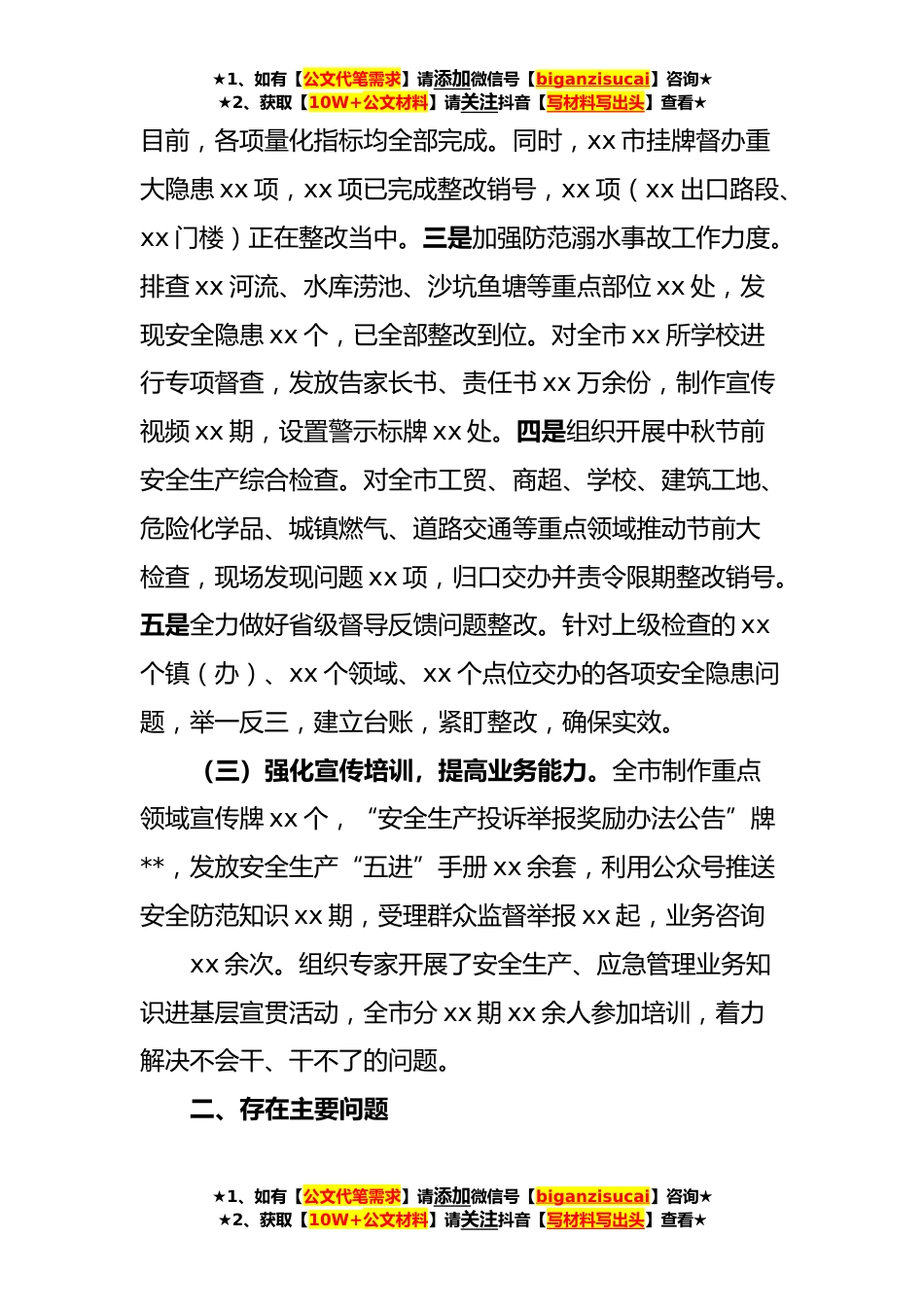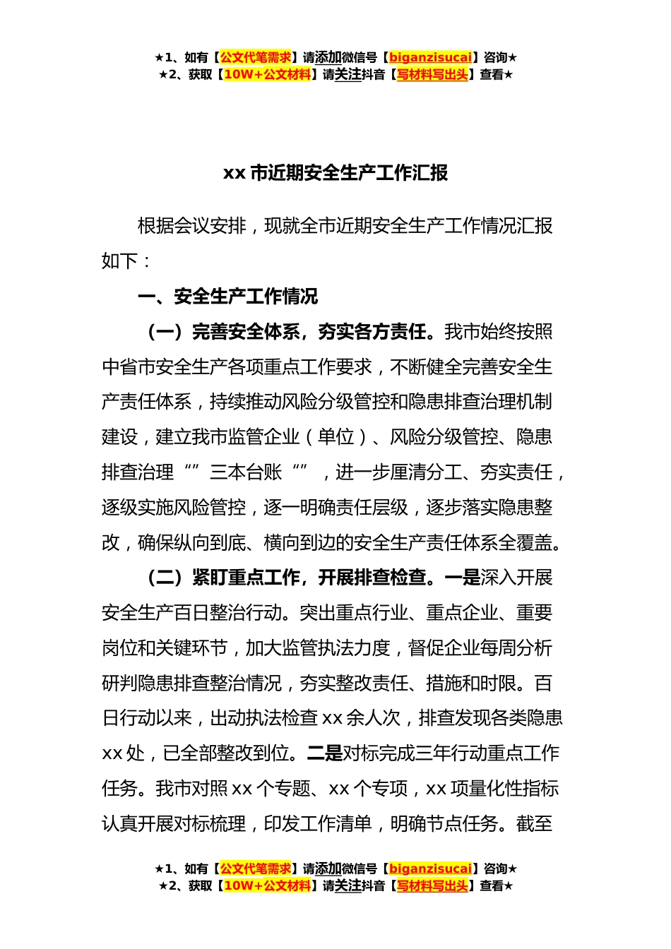 ★1、如有【公文代笔需求】请添加微信号【biganzisucai】咨询★★2、获取【10W+公文材料】请关注抖音【写材料写出头】查看★xx市近期安全生产工作汇报根据会议安排,现就全市近期安全生产工作情况汇报如下:一、安全生产工作情况(一)完善安全体系,夯实各方责任。我市始终按照中省市安全生产各项重点工作要求,不断健全完善安全生产责任体系,持续推动风险分级管控和隐患排查治理机制建设,建立我市监管企业(单位)、风险分级管控、隐患排查治理“”三本台账“”,进一步厘清分工、夯实责任,逐级实施风险管控,逐一明确责任层级,逐步落实隐患整改,确保纵向到底、横向到边的安全生产责任体系全覆盖。(二)紧盯重点工作,开展排查检查。一是深入开展安全生产百日整治行动。突出重点行业、重点企业、重要岗位...