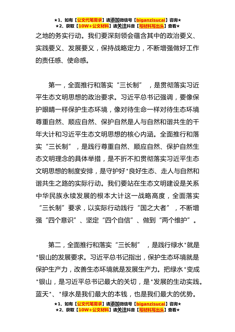 ★1、如有【公文代笔需求】请添加微信号【biganzisucai】咨询★★2、获取【10W+公文材料】请关注抖音【写材料写出头】查看★在全面推行和落实“三长制”工作会上的讲话稿今天,我们召开全面推行和落实“林长制”“河长制”“路长制”“三长制”工作会议。主要任务是,深入学习贯彻习近平生态文明思想,认真落实市委、市政府关于全面推行和落实“河长制”“林长制”有关工作部署,进一步明确目标要求和具体任务,压实工作责任,细化工作举措,以钉钉子的精神切实把“三长制”各项工作抓实抓细、抓出成效。刚才,**同志、**同志、**同志分别对“林长制”“河长制”“路长制”工作作了部署和安排,通报了当前工作存在的主要问题,提出工作要求,我都赞同,请大家抓好落实。下面,我再讲三点意见。一、深刻领会全面推...