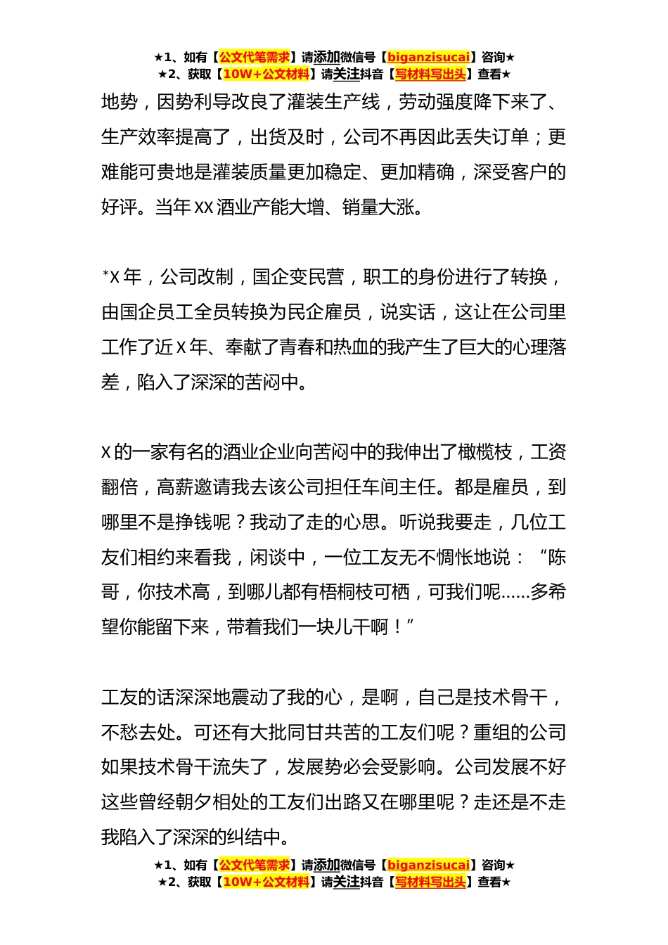 ★1、如有【公文代笔需求】请添加微信号【biganzisucai】咨询★★2、获取【10W+公文材料】请关注抖音【写材料写出头】查看★宣讲材料:勇啃“硬骨头”力搏“拦路虎”X朋友们:大家好!我是X酒业的X,汇报的题目是《勇啃“硬骨头”,力搏“拦路虎”》。工作X多年来,我一直是在车间工作,*X年担任X车间主任的。*X年,正是白酒产业十年黄金期的高速发展期,赶上趟儿,公司的订单多、销量大,灌装车间的工人们常加班加点,但因灌装流水线落后,效率低下、灌装质量不稳定,常常不能按时交货,多次遭遇客户的诟病。劳动强度大,工人们体能消耗大,也颇有怨言……改造灌装流水线迫在眉睫!可怎么改呢?我一有空就蹲在生产线前琢磨,同车间技工们技术攻关,利用生产淡季,经过X个月的努力,根据车间★1、如有【公文代笔需...