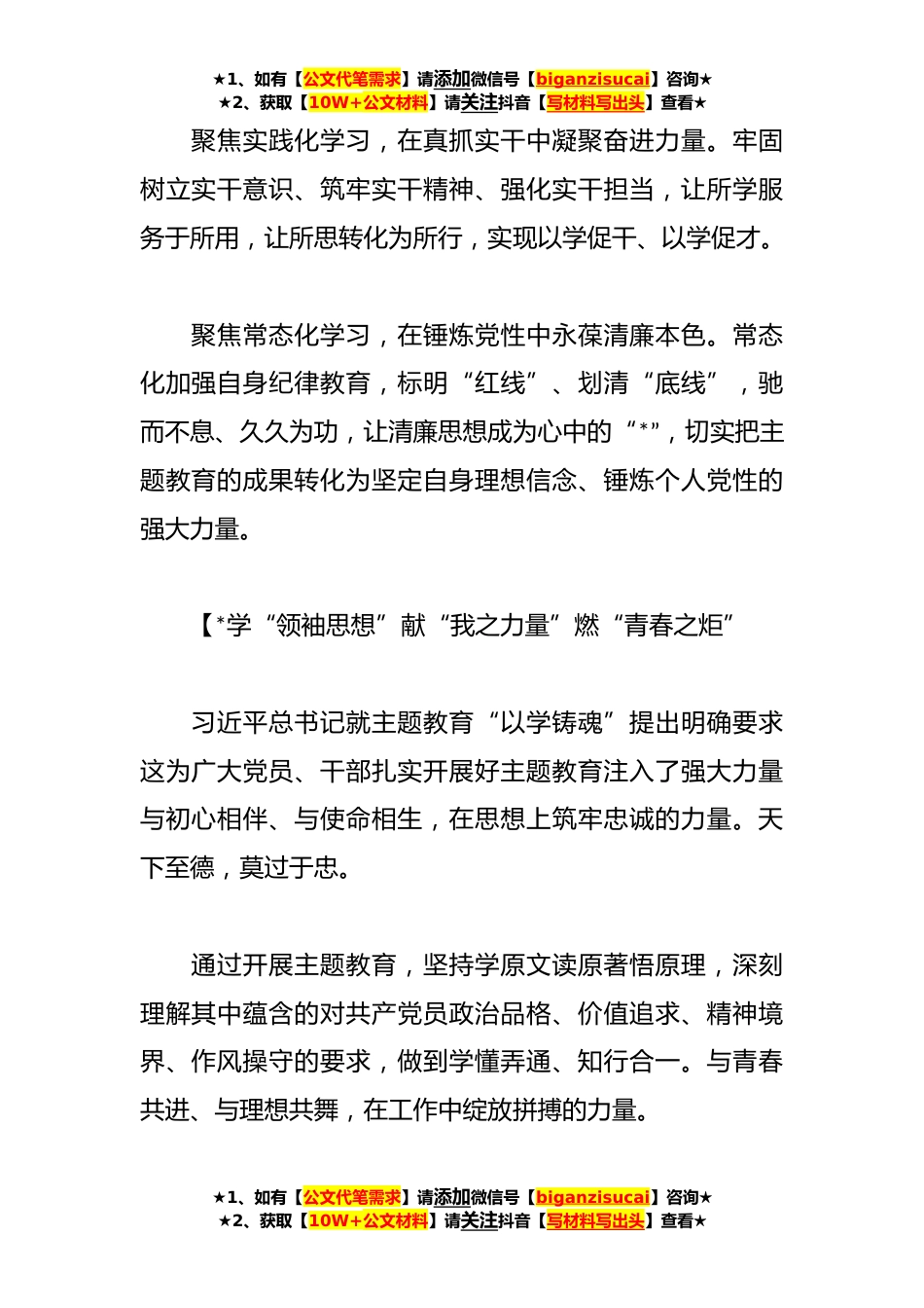 ★1、如有【公文代笔需求】请添加微信号【biganzisucai】咨询★★2、获取【10W+公文材料】请关注抖音【写材料写出头】查看★主题教育专题研讨简短发言汇编(*)篇【*聚焦“三化”学习以主题教育“补钙”“充电”建新功起势决定胜势,在全面贯彻落实党的二十大精神的开局之年,开展主题教育恰逢其时,这也成为了全党上下的一个热词、一股*、一根杠杆。聚焦系统化学习,在深学细悟中筑牢忠诚警魂。作为一名新时代青年党员,要不断提升自己的思想深度和理论高度,善于把内化于心的新理论、新知识、新本领融入到贯彻落实党的二十大精神中去,融入到推动新时代警务保障工作高质量发展中去。★1、如有【公文代笔需求】请添加微信号【biganzisucai】咨询★★2、获取【10W+公文材料】请关注抖音【写材料写出头】查看★★1...