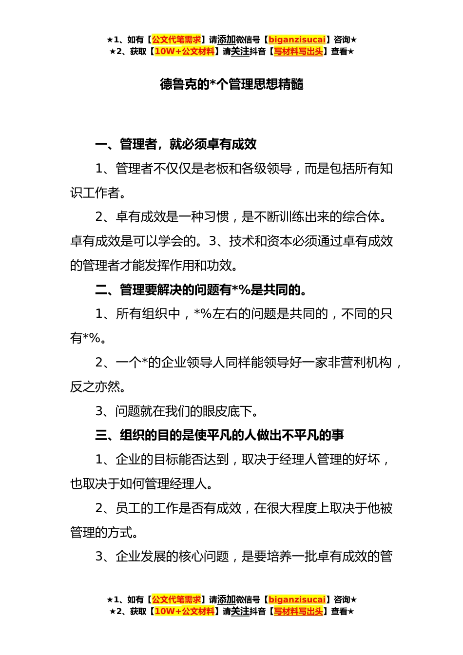 ★1、如有【公文代笔需求】请添加微信号【biganzisucai】咨询★★2、获取【10W+公文材料】请关注抖音【写材料写出头】查看★德鲁克的*个管理思想精髓一、管理者,就必须卓有成效1、管理者不仅仅是老板和各级领导,而是包括所有知识工作者。2、卓有成效是一种习惯,是不断训练出来的综合体。卓有成效是可以学会的。3、技术和资本必须通过卓有成效的管理者才能发挥作用和功效。二、管理要解决的问题有*%是共同的。1、所有组织中,*%左右的问题是共同的,不同的只有*%。2、一个*的企业领导人同样能领导好一家非营利机构,反之亦然。3、问题就在我们的眼皮底下。三、组织的目的是使平凡的人做出不平凡的事1、企业的目标能否达到,取决于经理人管理的好坏,也取决于如何管理经理人。2、员工的工作是否有成效,在很大程...