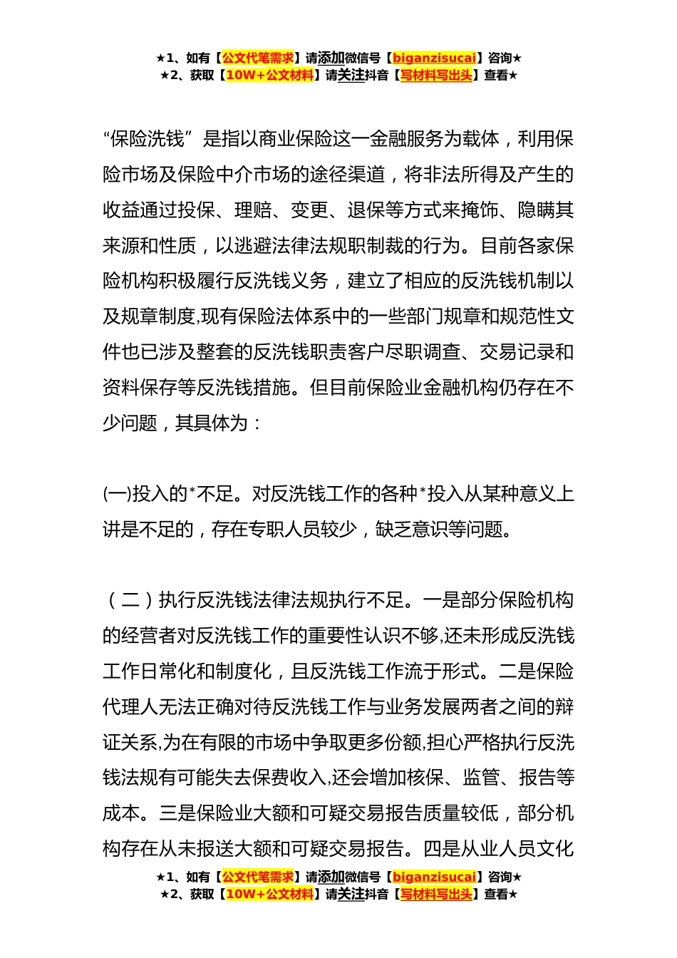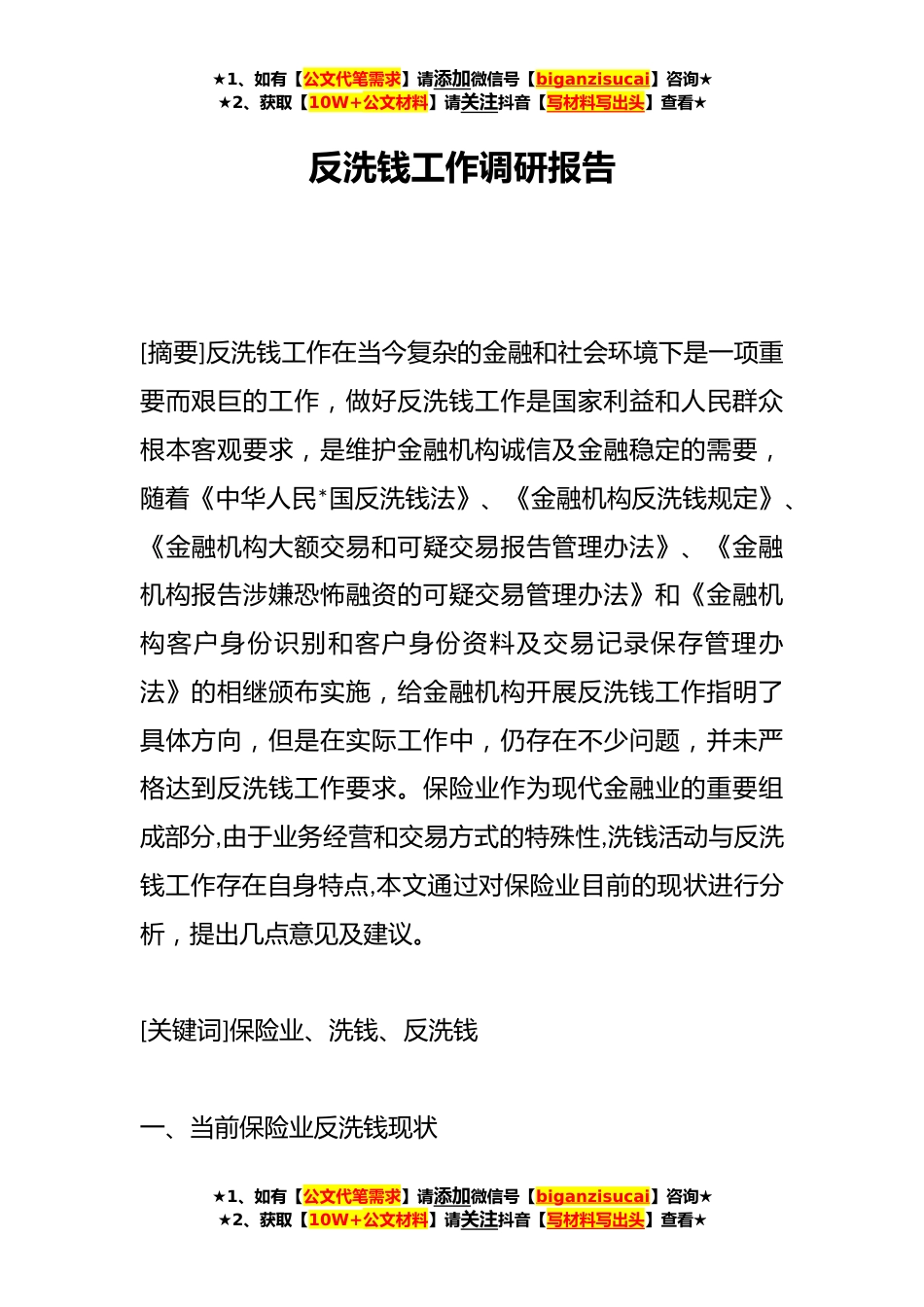 ★1、如有【公文代笔需求】请添加微信号【biganzisucai】咨询★★2、获取【10W+公文材料】请关注抖音【写材料写出头】查看★反洗钱工作调研报告[摘要]反洗钱工作在当今复杂的金融和社会环境下是一项重要而艰巨的工作,做好反洗钱工作是国家利益和人民群众根本客观要求,是维护金融机构诚信及金融稳定的需要,随着《中华人民*国反洗钱法》、《金融机构反洗钱规定》、《金融机构大额交易和可疑交易报告管理办法》、《金融机构报告涉嫌恐怖融资的可疑交易管理办法》和《金融机构客户身份识别和客户身份资料及交易记录保存管理办法》的相继颁布实施,给金融机构开展反洗钱工作指明了具体方向,但是在实际工作中,仍存在不少问题,并未严格达到反洗钱工作要求。保险业作为现代金融业的重要组成部分,由于业务经营和交易...